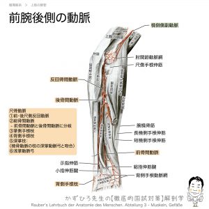 下尺側側副動脈は上腕骨内側上顆の上で上腕動脈より出て、内側上腕筋間中隔を貫き、周囲の筋に枝を与えた後に、肘関節動脈網に加わります。