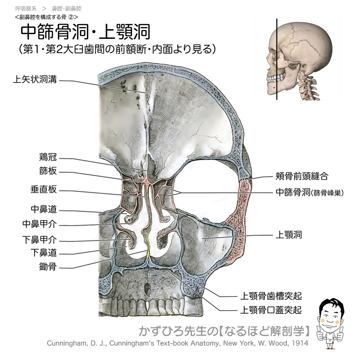 - 中鼻道:前・中篩骨洞、上顎洞、前頭洞が開口