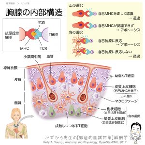 扁桃は咽頭粘膜に出来たリンパ小節の集団です。扁桃の粘膜は重層扁平上皮で、見た目にデコボコした感じです。このデコボコの表面には、粘膜が陥入したくぼみ(陰窩) が散在します。この陰窩の粘膜下に多数のリンパ小節が並んでいます。細菌や異物などの抗原刺激により、リンパ小節ではBリンパ球が増生され、抗体産生が促されます。