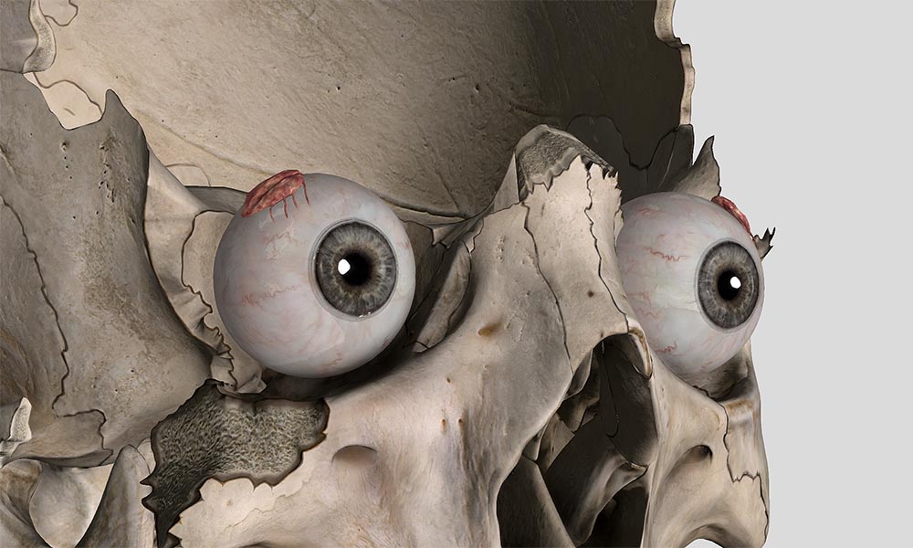 眼球は眼窩の中におさまり、前面は眼瞼によって保護され、後端は視神経によって脳とつながっている。直径約25mm、重量約7. 5gの球形体で、眼球の周囲には眼窩脂肪体があり、外部からの衝撃に対してクッションの役目をしている。
