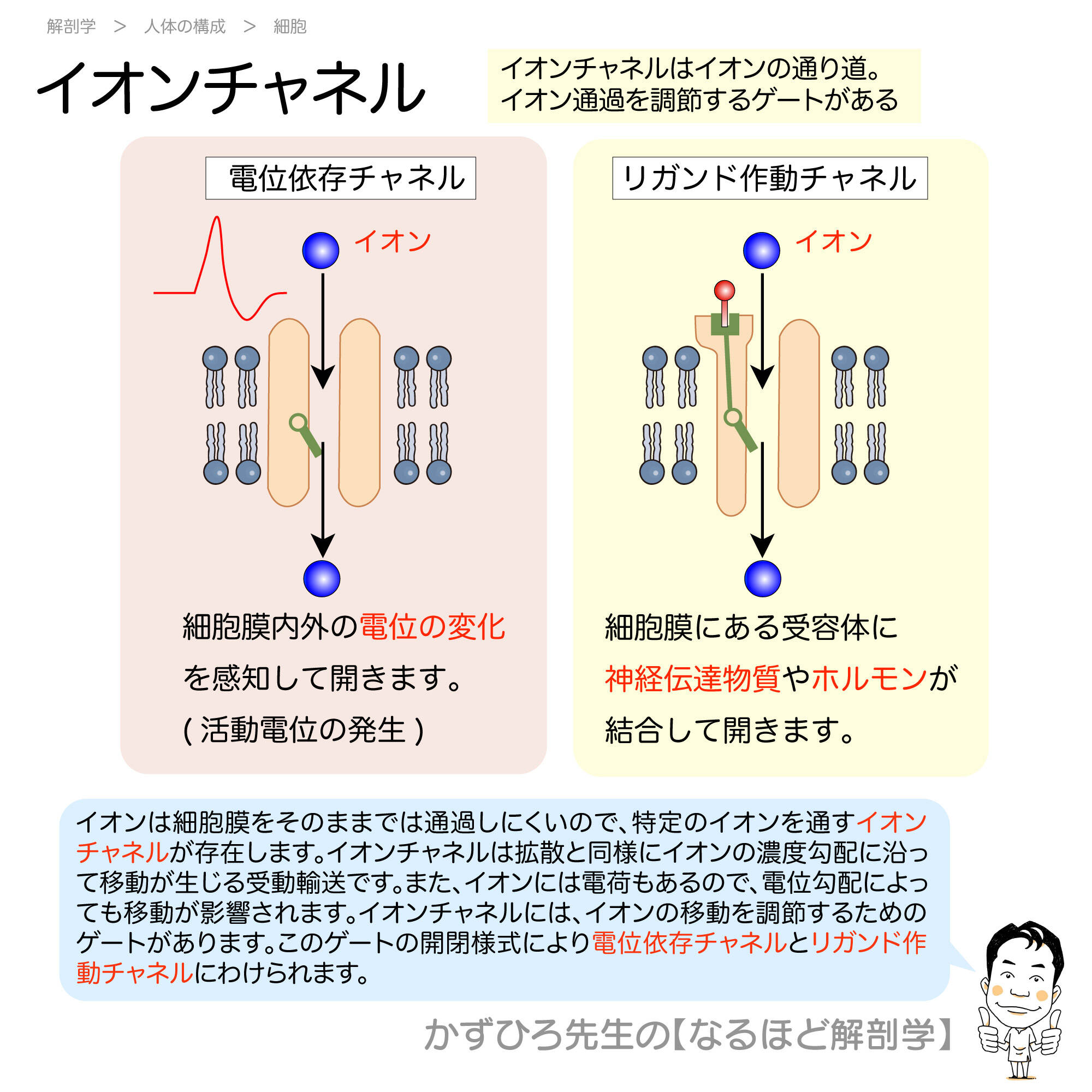 - イオンチャネル:イオンの通り道、ゲートで開閉