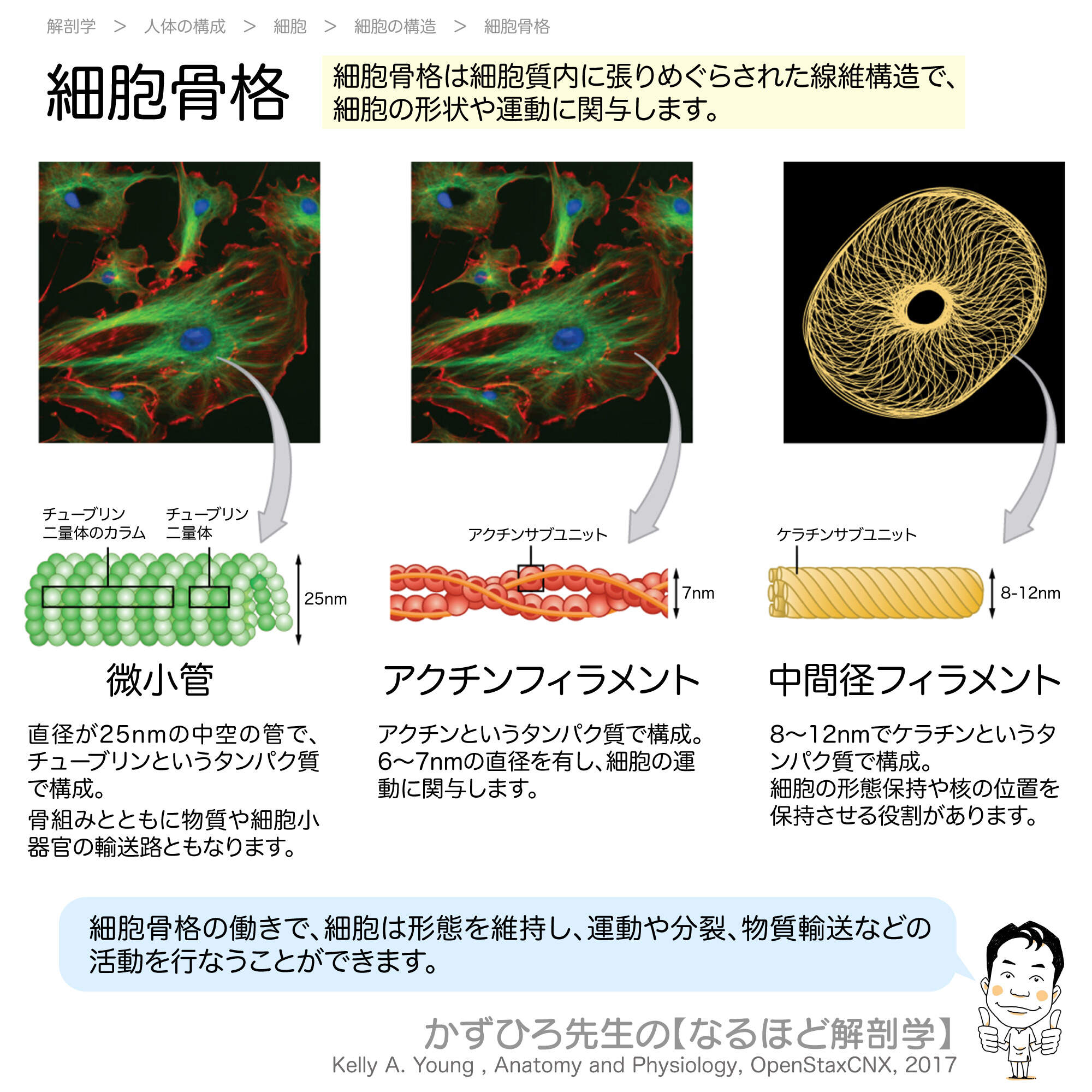 アクチンフィラメントは細胞運動に関与します。微小管は物質輸送、中間径フィラメントは形態保持が主な機能です。