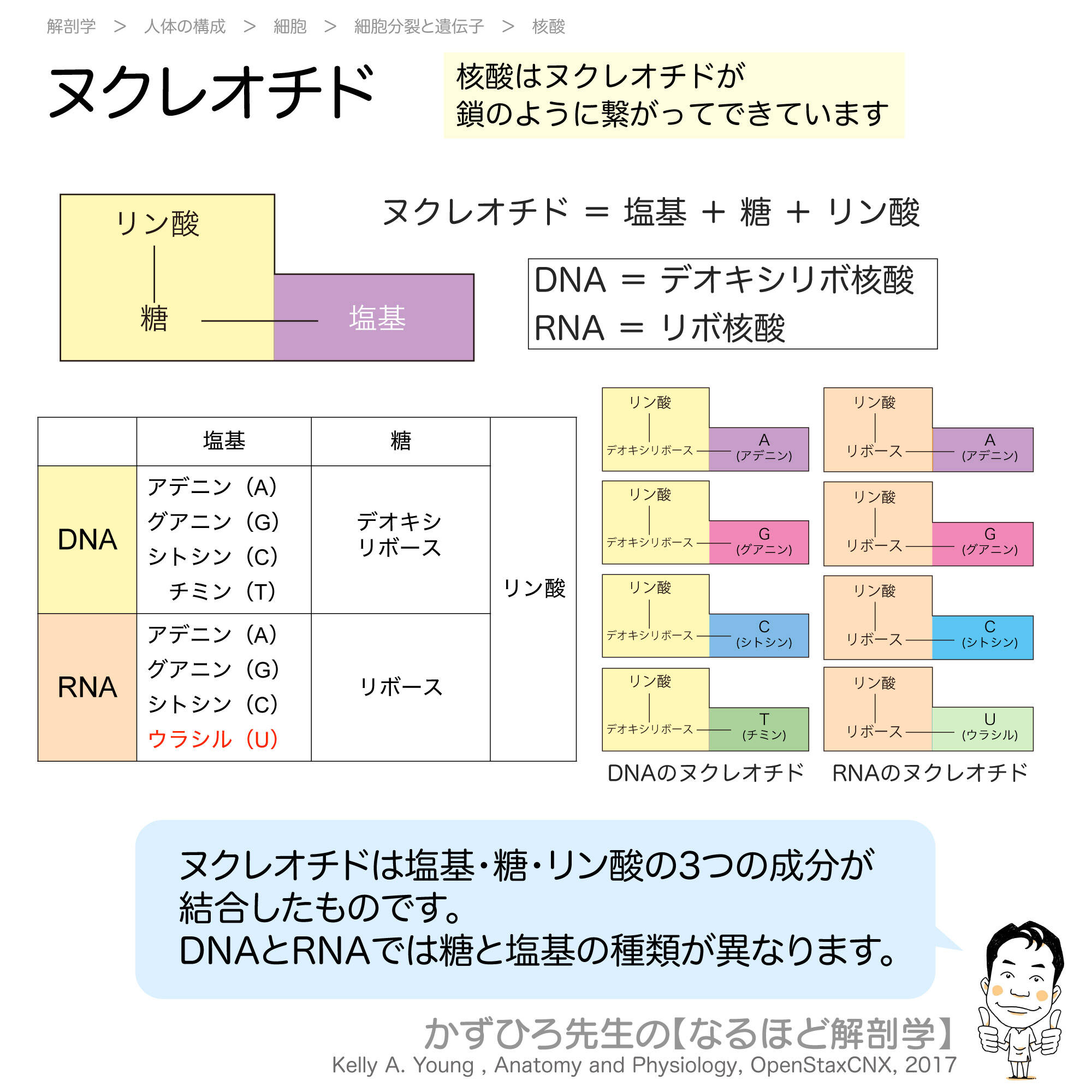 - ヌクレオチド = 塩基 + 糖 + リン酸