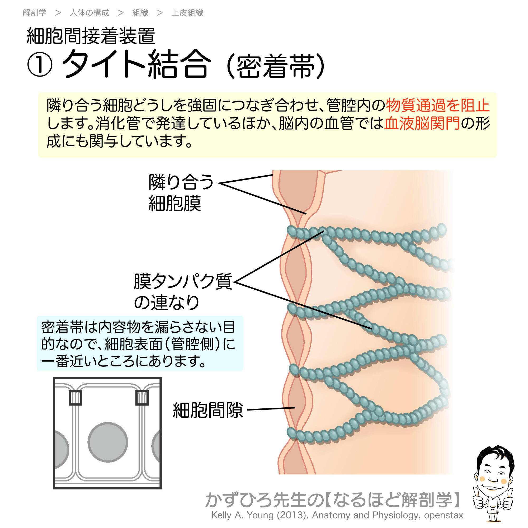 タイト結合(密着帯、tight junction)は、隣り合う細胞の細胞膜を密着させて、物質の通過を阻止する構造です。