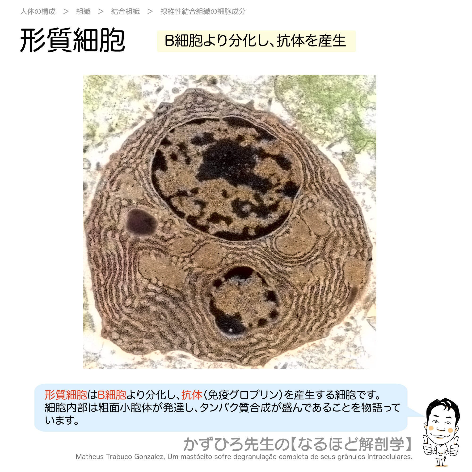 形質細胞は抗体(タンパク質)を大量に産生するため、粗面小胞体が発達しています。
