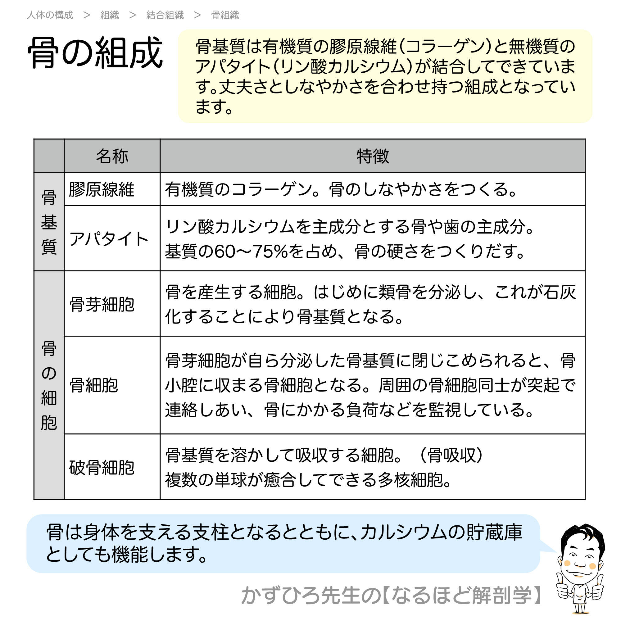 | アパタイト(リン酸カルシウム) | 無機質、基質の60〜75%、骨の硬さをつくる |