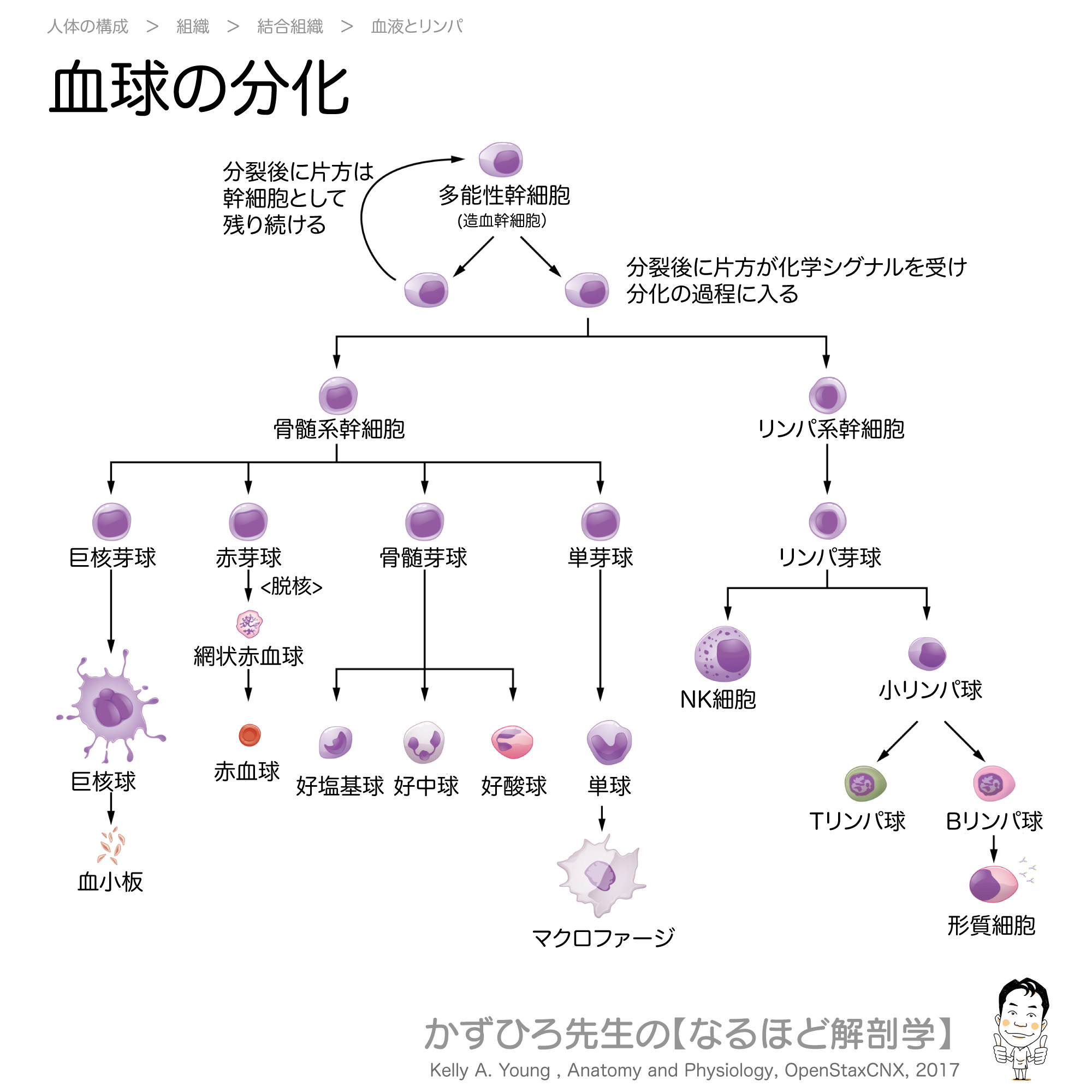 - 赤血球は脱核して成熟、単球→マクロファージ、B細胞→形質細胞