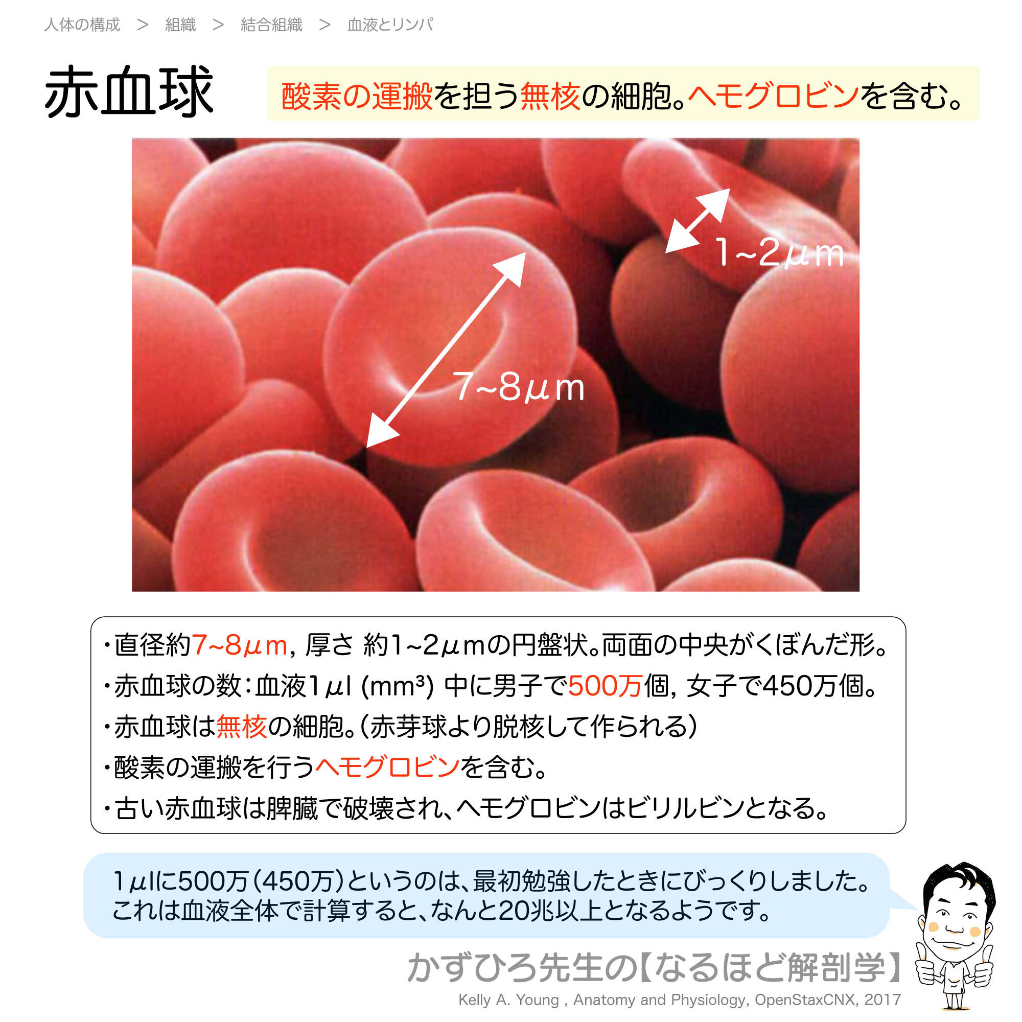 赤血球数は男子約500万/μL、女子約450万/μLで、男性の方が多いです。