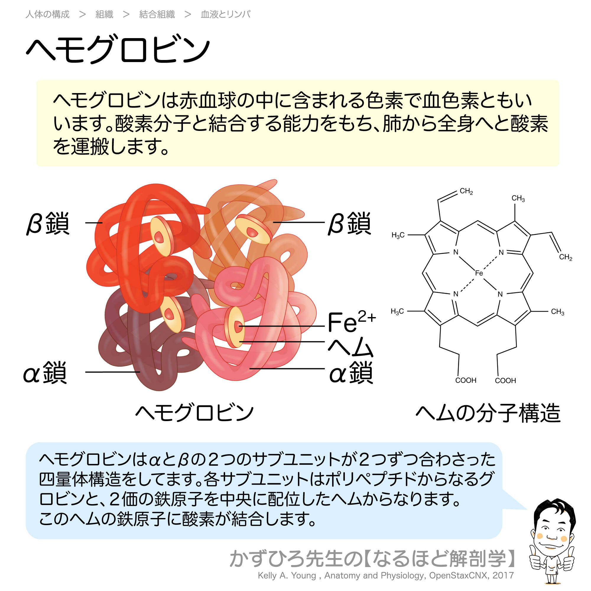 ヘモグロビンのヘムに含まれる鉄原子に酸素が結合します。