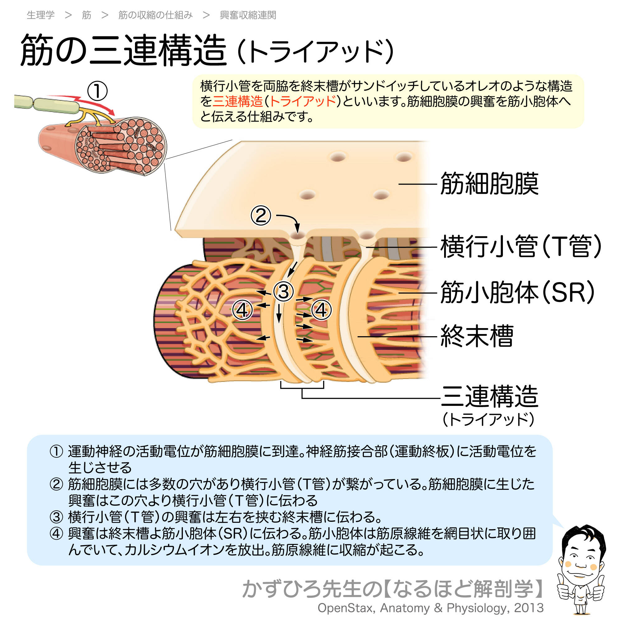 横行小管(T管)を両脇から終末槽がサンドイッチしている構造を三連構造(トライアッド)といいます。筋細胞膜の興奮を筋小胞体へ伝え、Ca2+を放出させる重要な構造です。今回は三連構造について詳しく解説します。