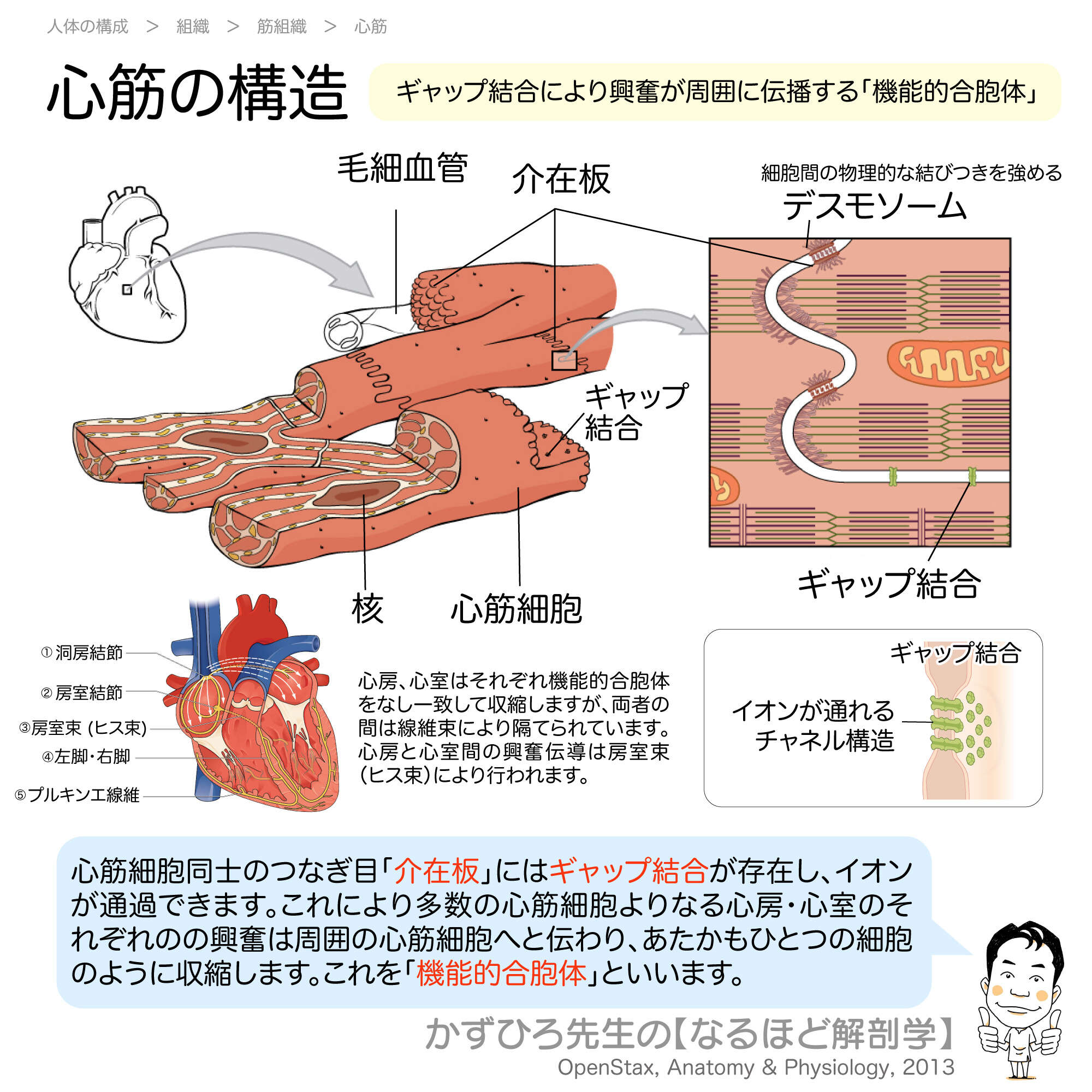 介在板のギャップ結合によりイオンが通過でき、心筋細胞が電気的に連結されて機能的合胞体を形成します。