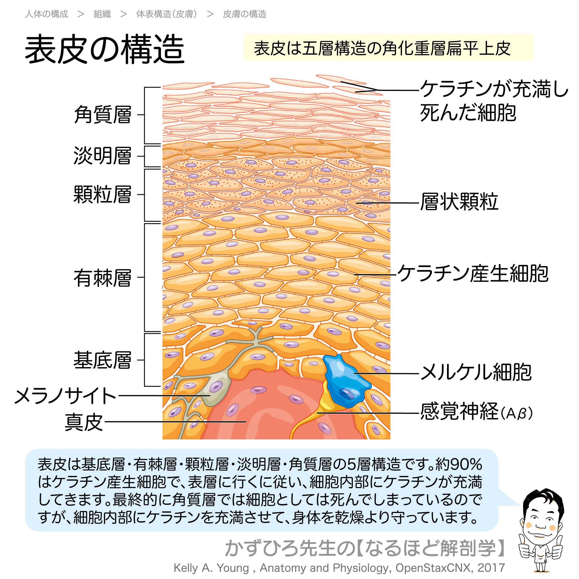 • 表皮は角質層・淡明層・顆粒層・有棘層・基底層の5層構造