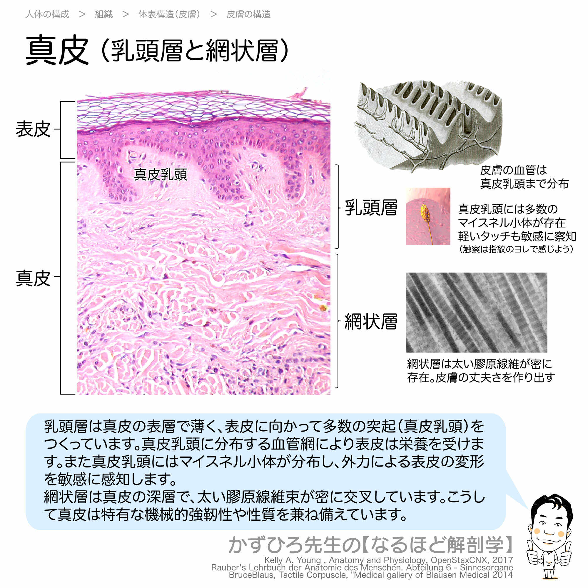 真皮は乳頭層と網状層の2層からなります。乳頭層は表皮に向かって突起を作り、マイスネル小体が分布しています。網状層は膠原線維が密に交叉し、皮膚の機械的強靭性を担っています。今回は真皮の構造について詳しく解説します。
