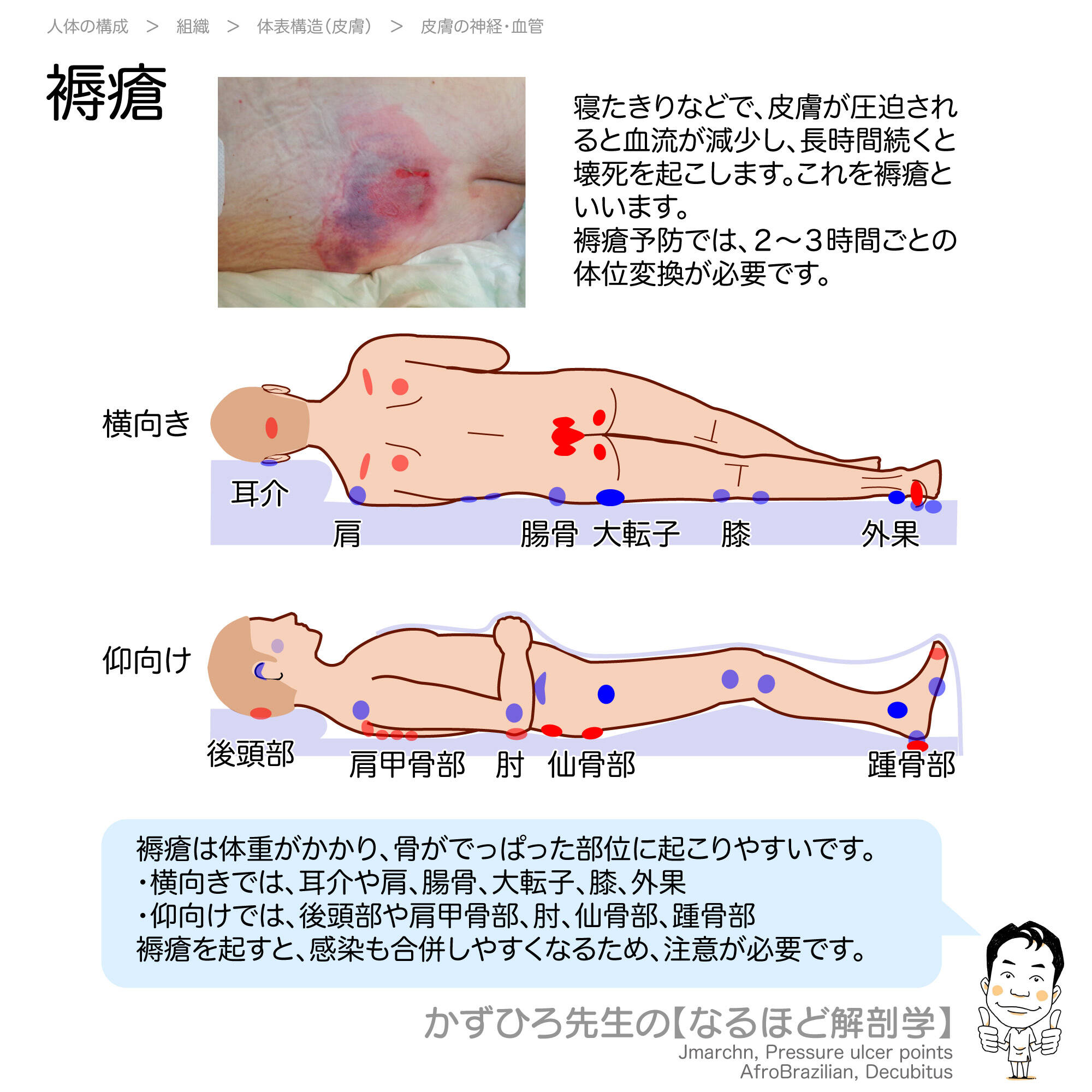 仰臥位では後頭部、肩甲骨部、仙骨部、踵骨部などに褥瘡が好発します。大転子、外果、腸骨は側臥位で好発します。