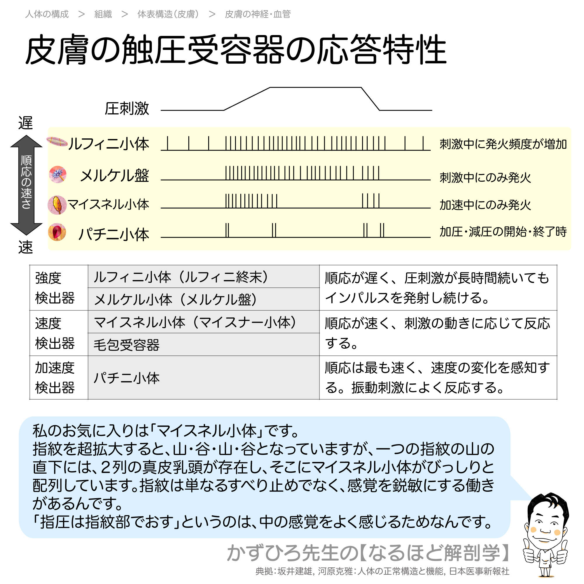 • 速順応性(速度・加速度検出器):マイスネル小体、パチニ小体
