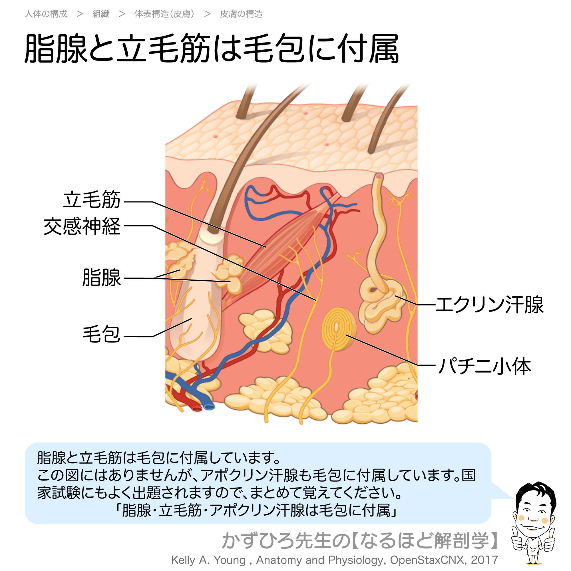 「毛包に付属=脂腺・立毛筋・アポクリン汗腺」が最重要です。