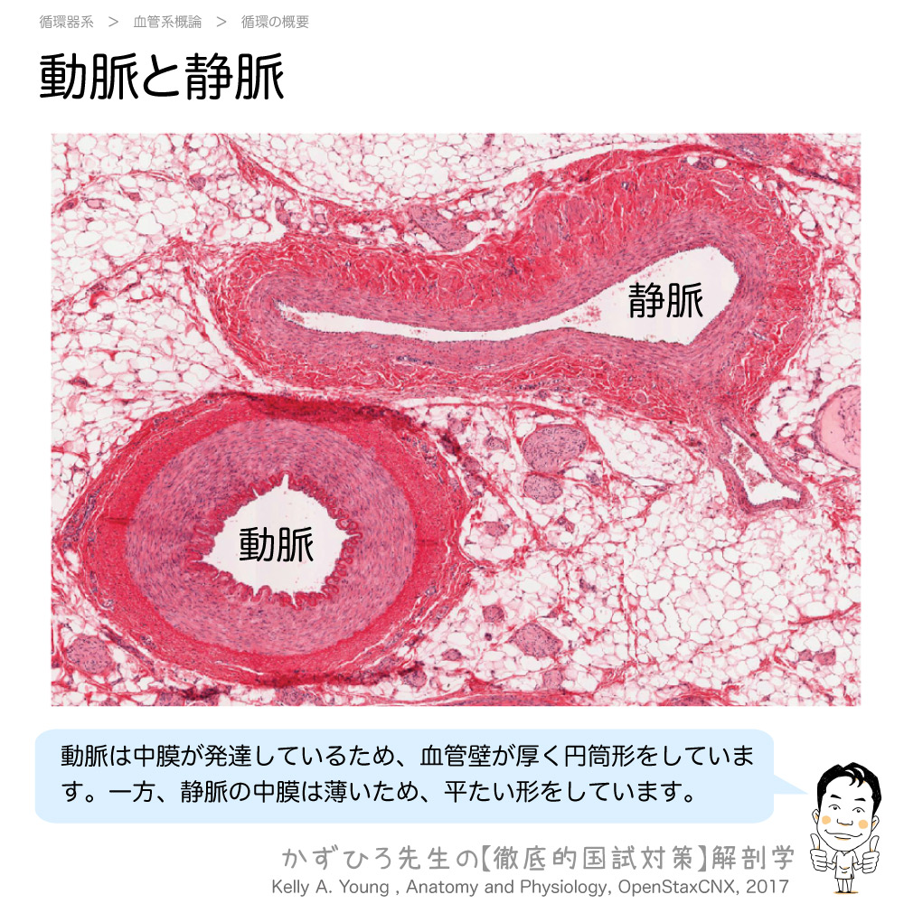 動脈は中膜が発達して厚く、静脈は中膜が薄いことが形態の違いを生みます。
