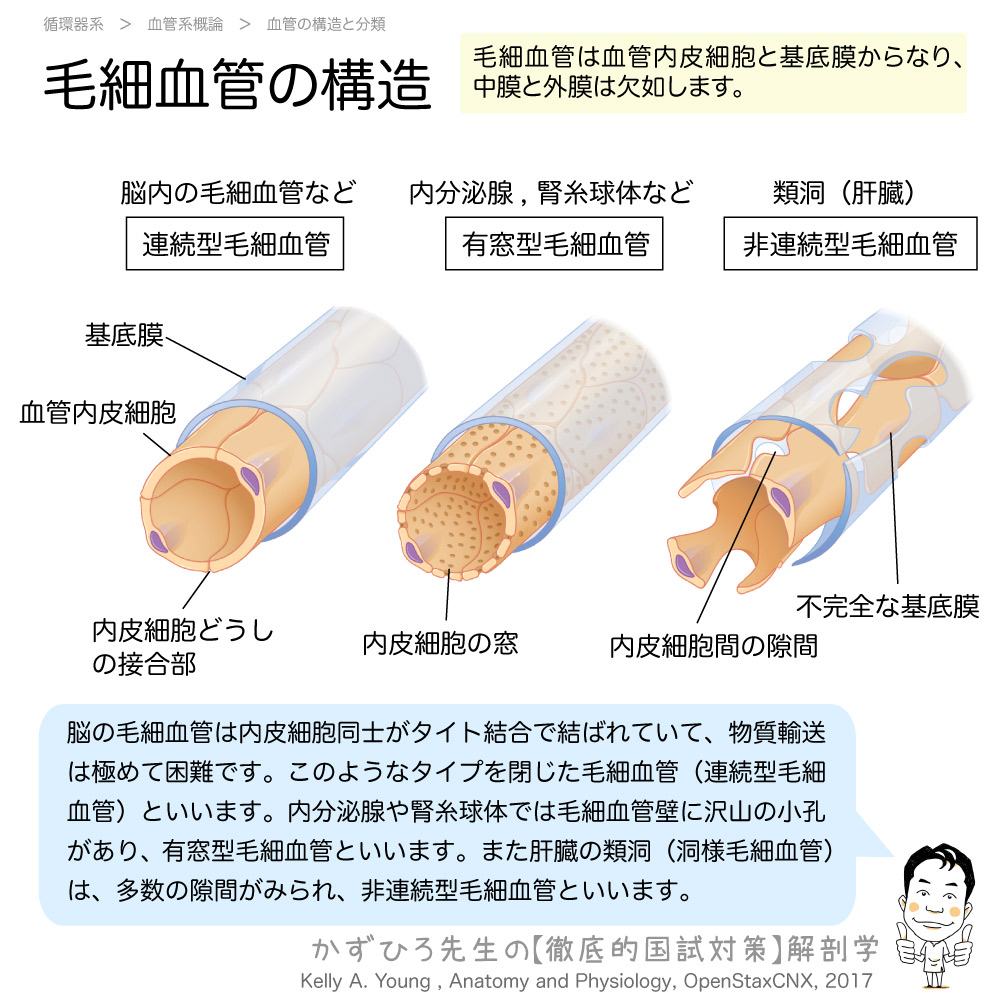 透過性は非連続型(隙間・不完全な基底膜)>有窓型(小孔)>連続型(タイト結合)の順です。