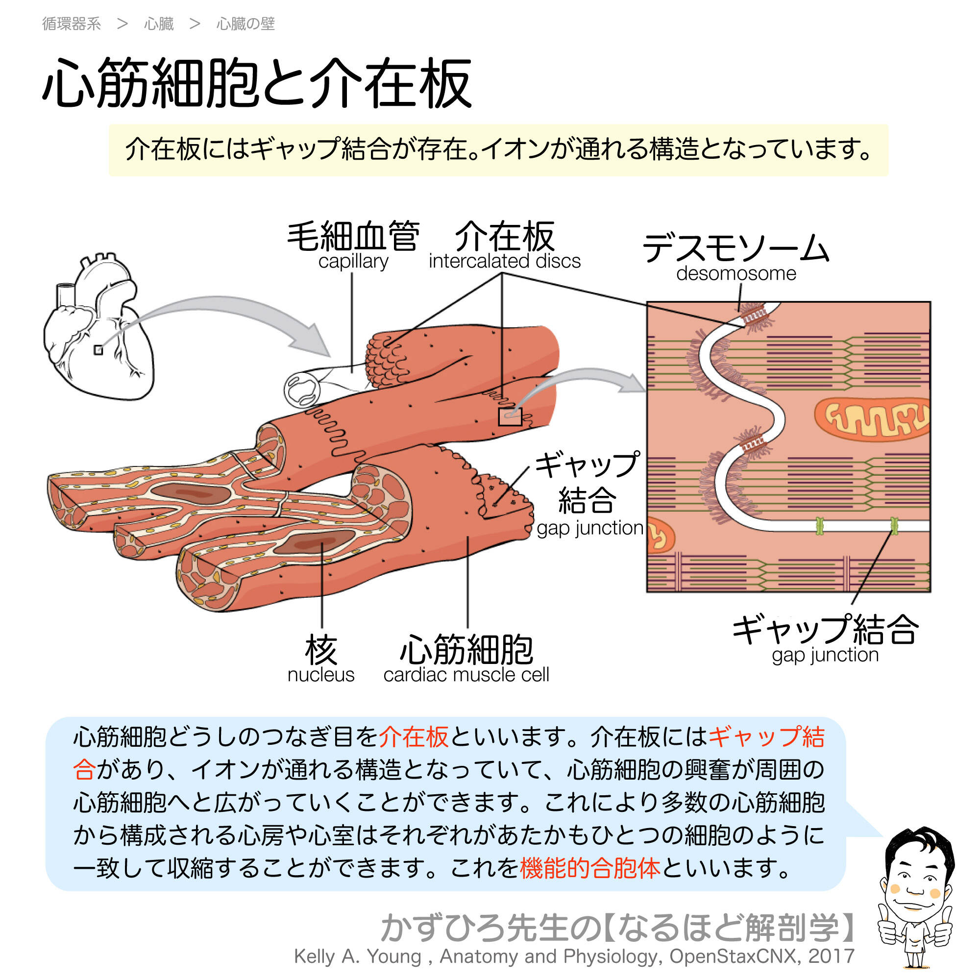 心筋細胞どうしのつなぎ目を介在板といいます。介在板にはギャップ結合が存在し、イオンが通れる構造となっています。