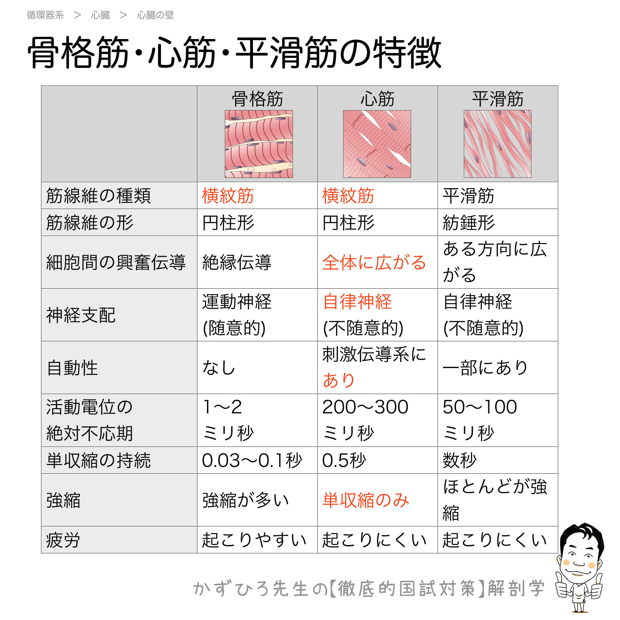 人体には骨格筋・心筋・平滑筋の3種類の筋があります。骨格筋と心筋は横紋筋ですが、随意筋は骨格筋のみです。心筋は単収縮のみで強縮しないという特徴があります。これらの比較は国家試験で超頻出です。