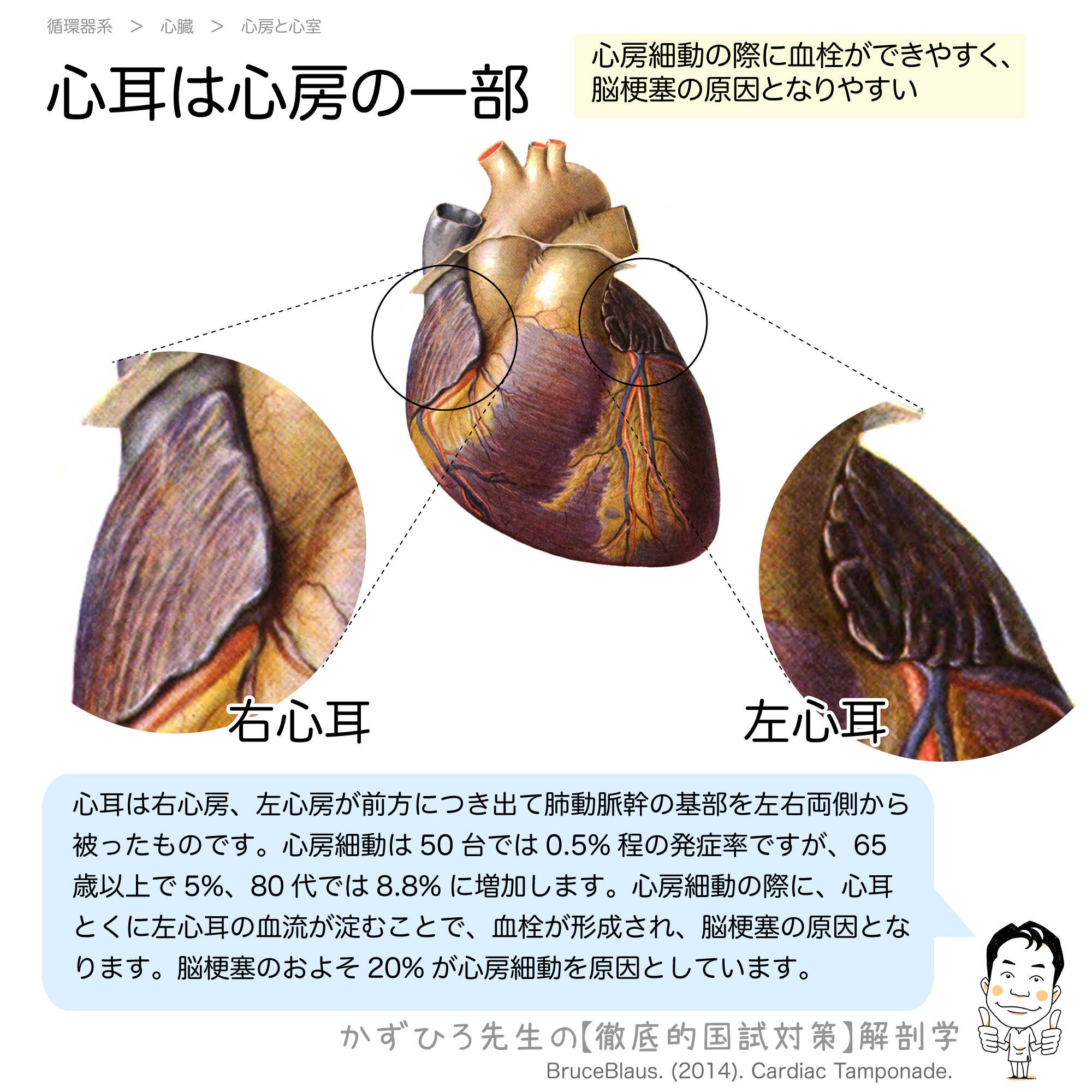 心耳は心房が前方に突き出した構造で、右心耳と左心耳があります。心房細動の際には特に左心耳で血流が淀み、血栓が形成されやすくなります。この血栓が脳に飛ぶと脳梗塞を引き起こすため、臨床的にも重要な構造です。