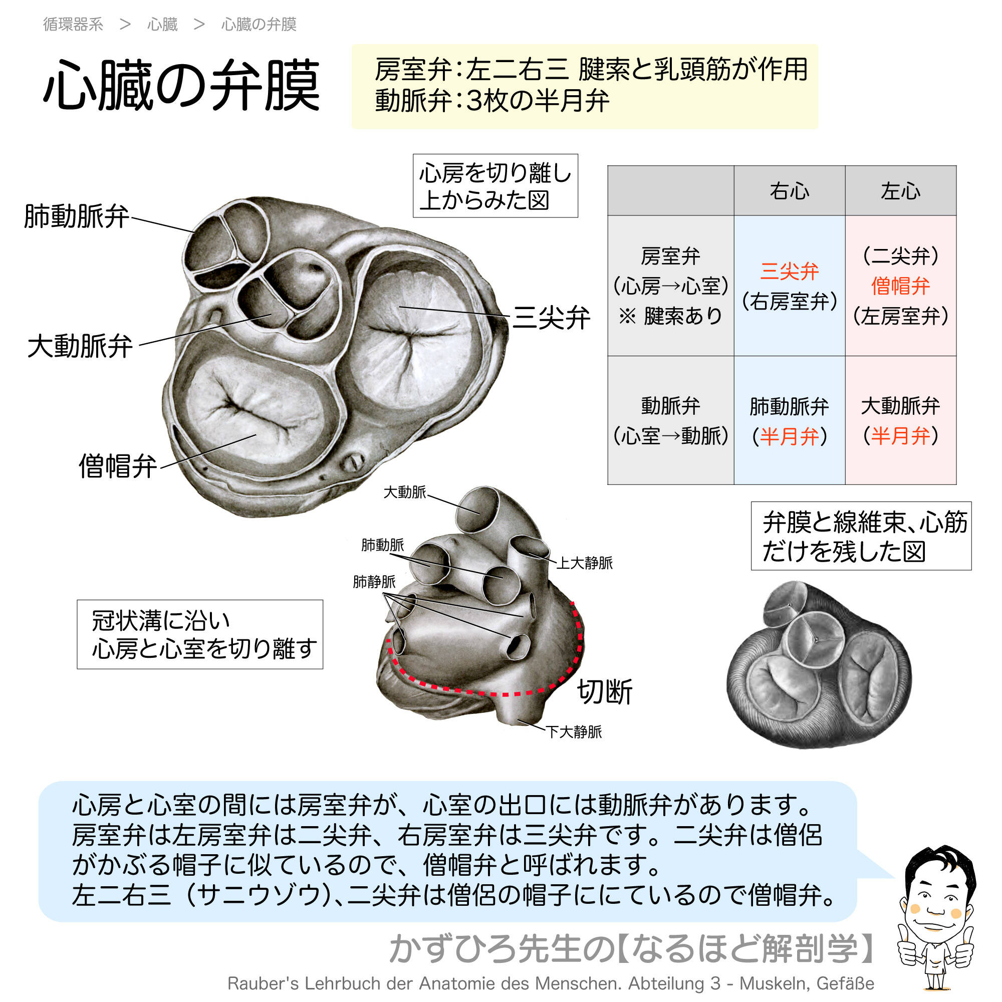 | 房室弁 | 左二右三、腱索と乳頭筋が作用 |