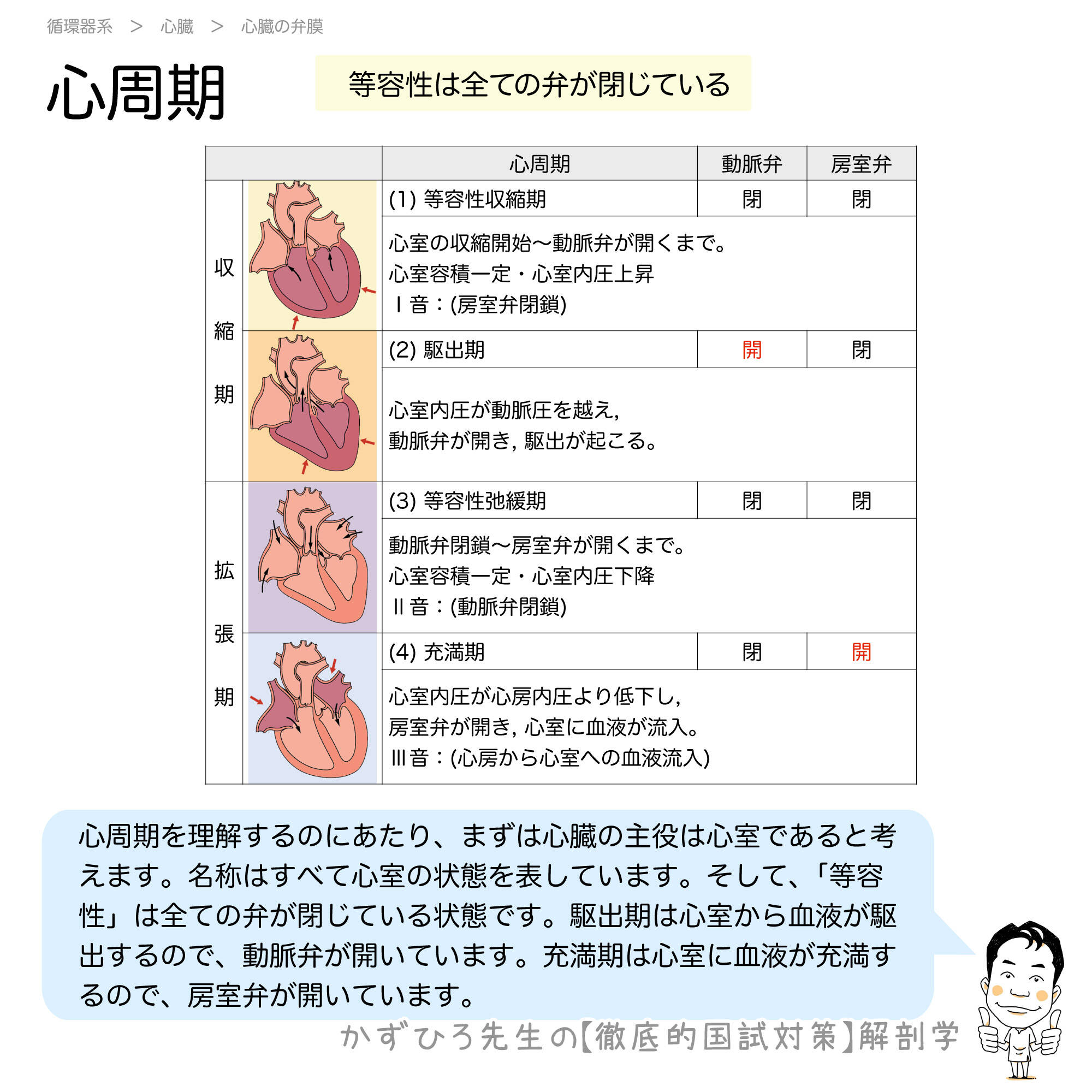 心周期は心臓の1拍動における一連の変化を表し、4つの時期に分けられます。「等容性」は全ての弁が閉じている状態を意味します。心音のI音は房室弁閉鎖、II音は動脈弁閉鎖によって生じます。