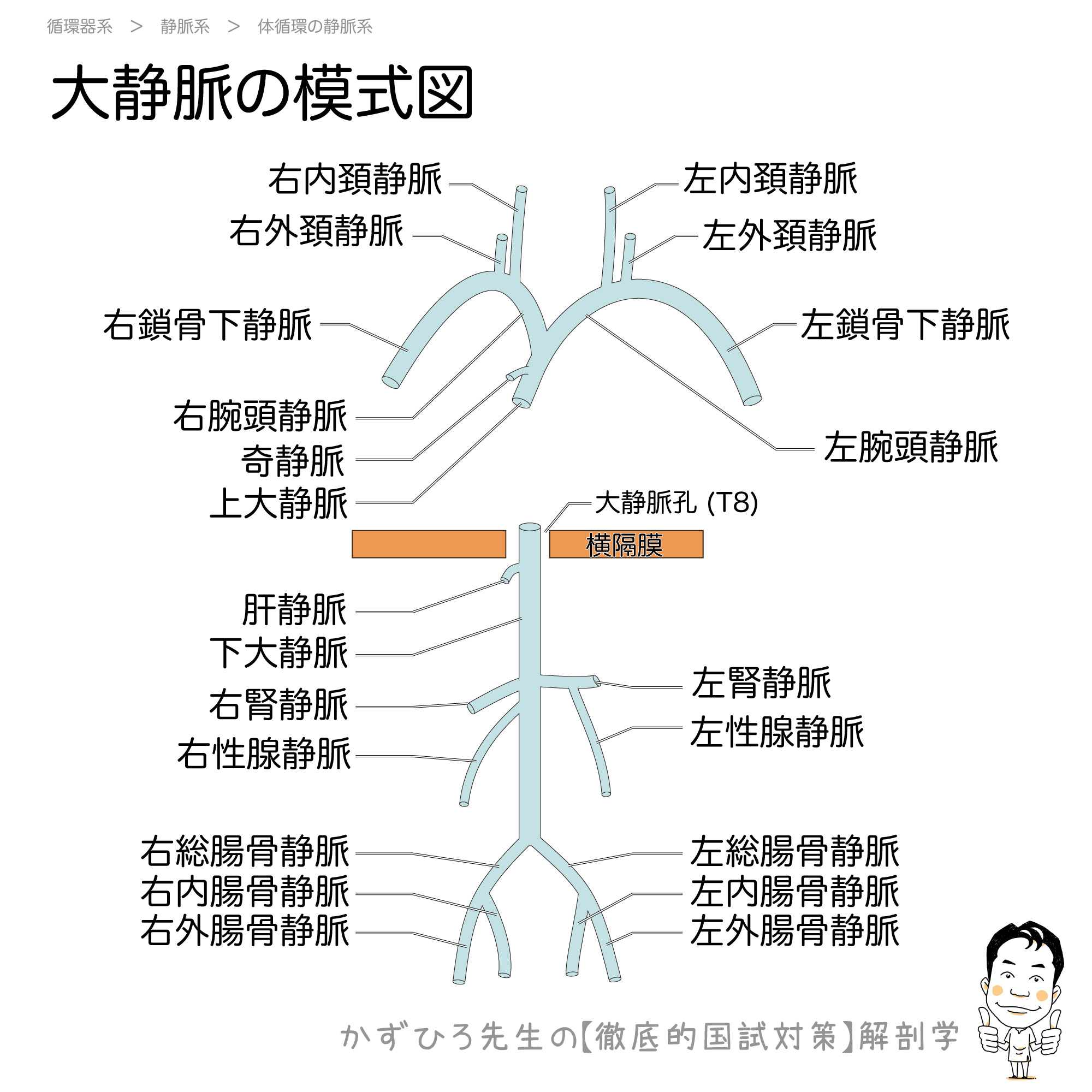 上大静脈と下大静脈は全身の静脈血を右心房に戻す2本の大きな静脈です。その形成過程と横隔膜を通過する位置は国家試験超頻出です。今回は、大静脈系の全体像について模式図的に理解しましょう。