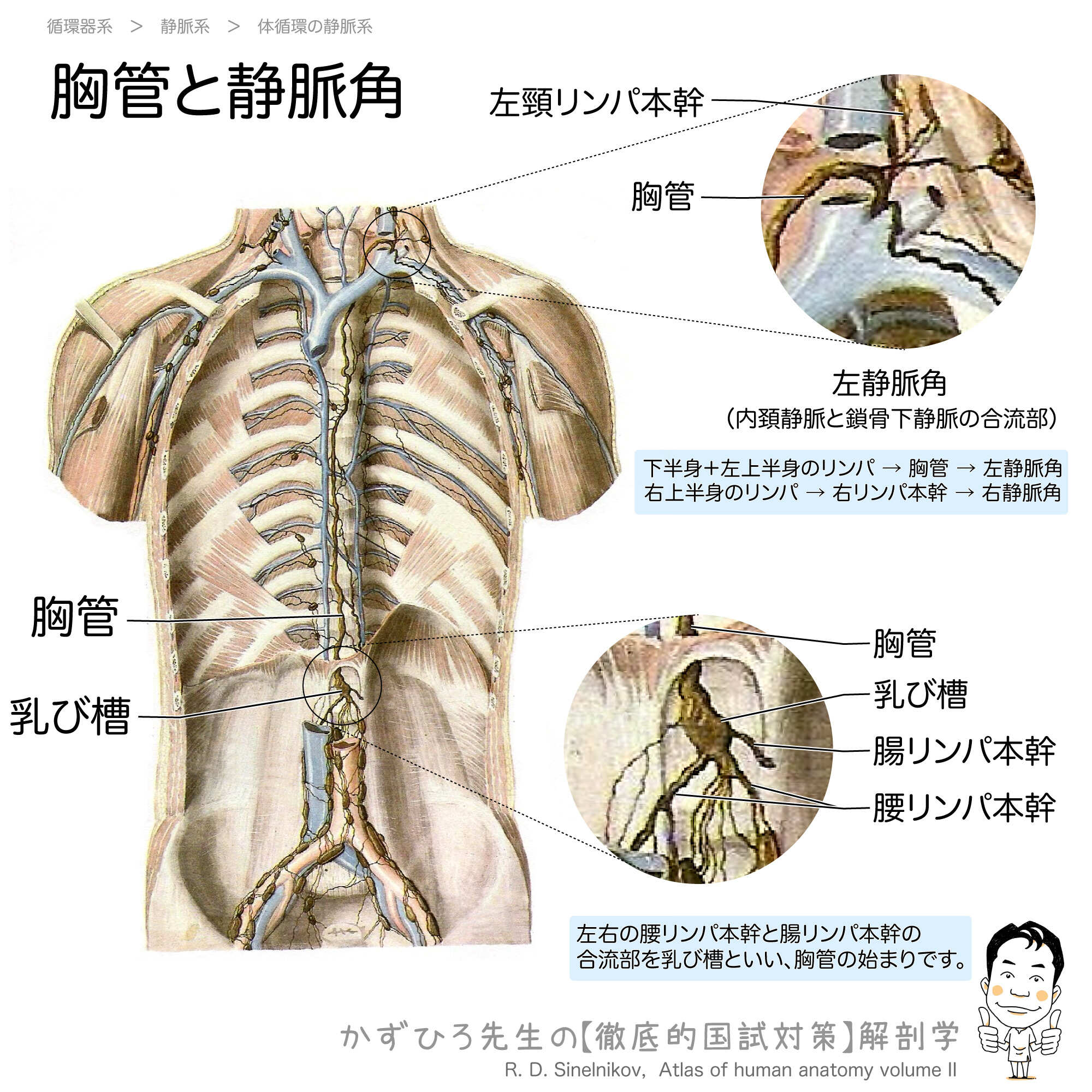 胸管は体内最大のリンパ管で、乳び槽(L1〜L2)から始まり、下半身と左上半身のリンパを集めて左静脈角に注ぎます。右上半身のリンパは右リンパ本幹を経て右静脈角に注ぎます。静脈角は内頸静脈と鎖骨下静脈の合流部です。