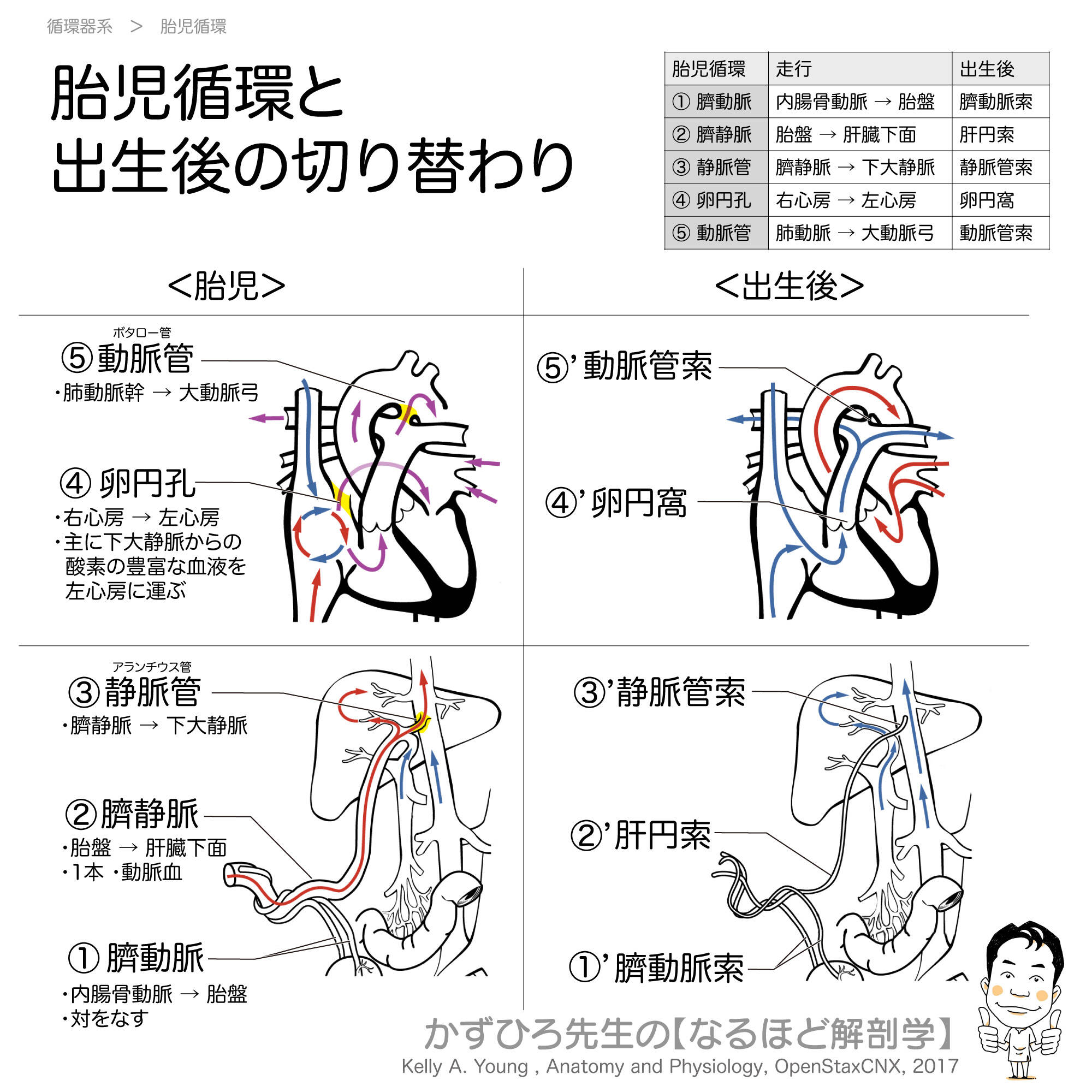 - 出生後、肺呼吸の開始により循環動態が大きく変化