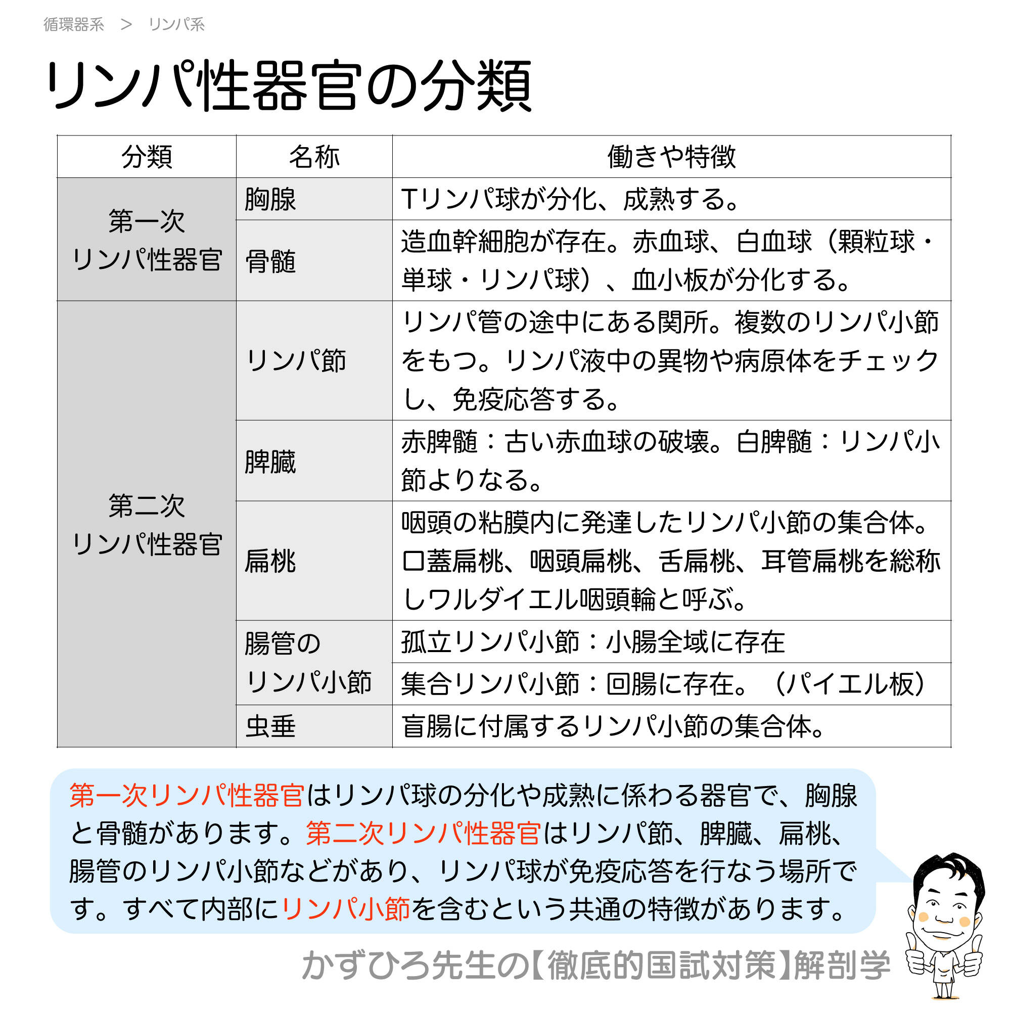 リンパ性器官は第一次リンパ性器官と第二次リンパ性器官に分類されます。第一次はリンパ球の分化・成熟を行い、第二次は免疫応答を行う場所です。国家試験で超頻出のテーマです。