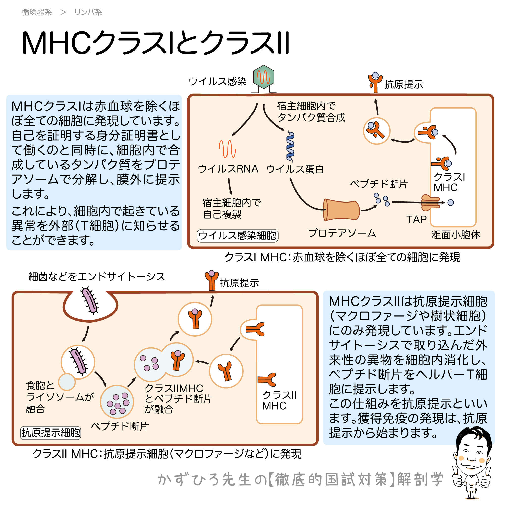 MHC(主要組織適合遺伝子複合体)は自己と非自己を識別するための分子です。クラスIはほぼ全ての有核細胞に発現し、クラスIIは抗原提示細胞のみに発現します。国家試験で超頻出のテーマです。