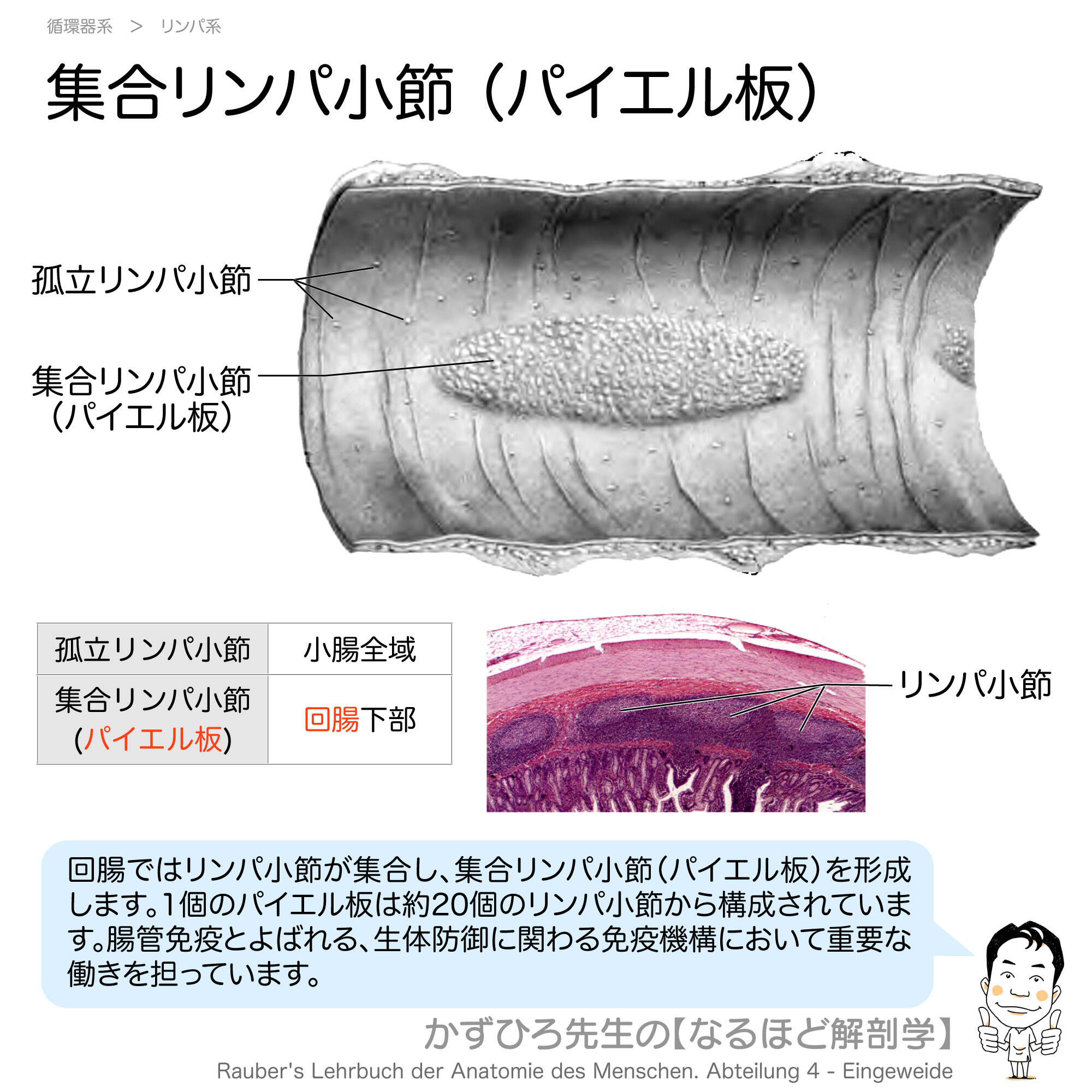 パイエル板(集合リンパ小節)は回腸下部に存在します。孤立リンパ小節は小腸全域に存在します。