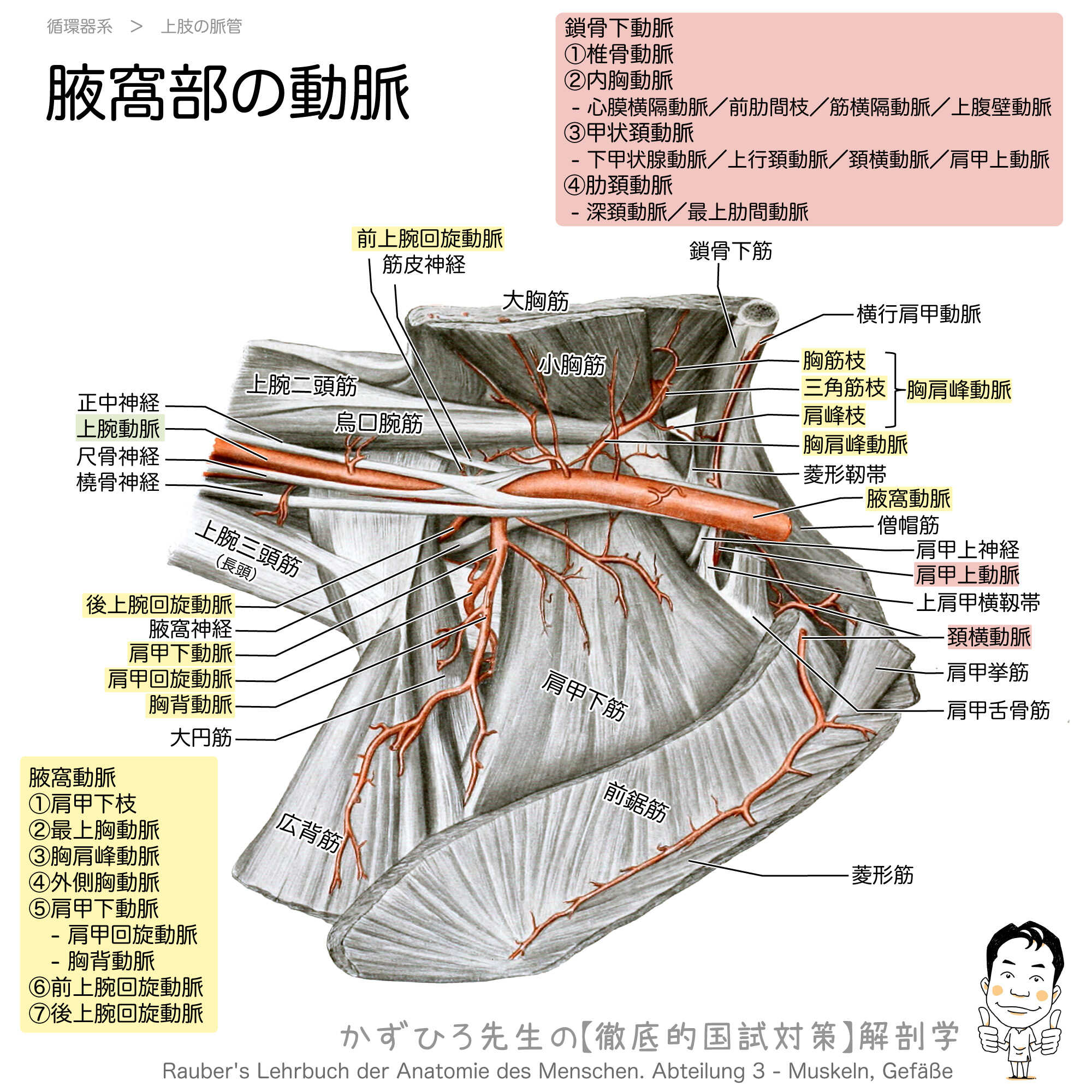 - 腋窩動脈の7枝: 肩甲下枝・最上胸動脈・胸肩峰動脈・外側胸動脈・肩甲下動脈・前/後上腕回旋動脈