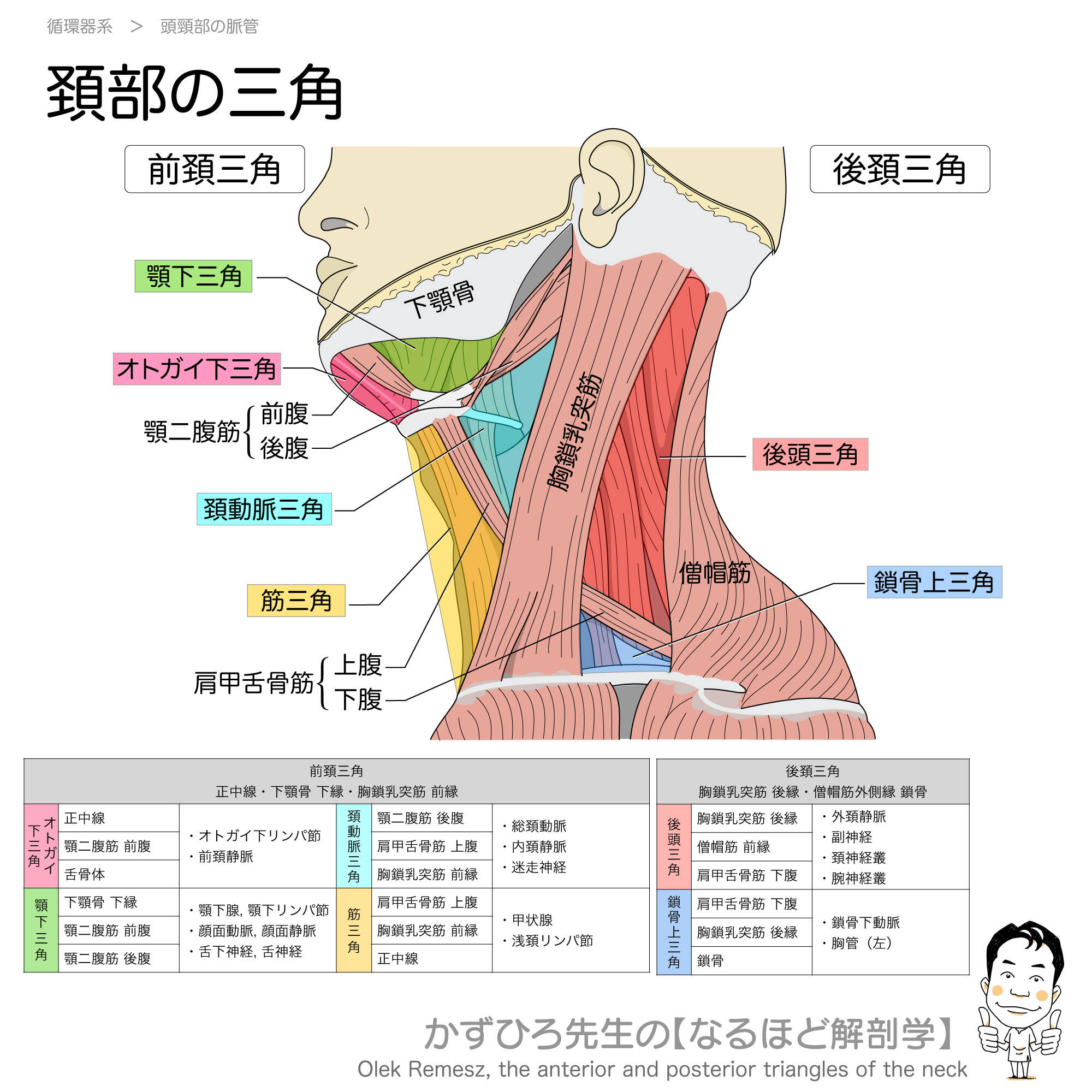 頚部は胸鎖乳突筋を境に前頚三角と後頚三角に分けられます。各三角の構成と内容物を理解することは、頚部の血管・神経の走行を把握する上で基本となります。特に頚動脈三角と鎖骨上三角の内容物は国家試験で頻出です。