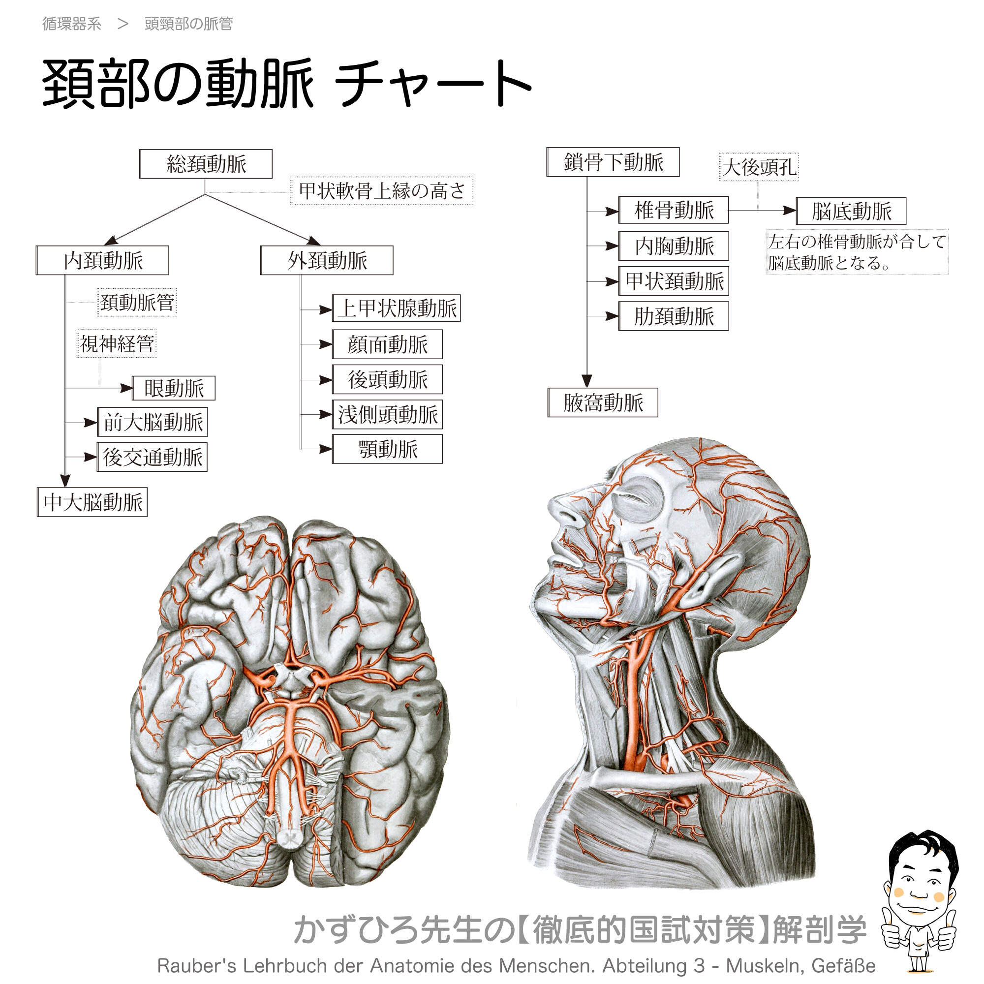 頚部の動脈は、総頚動脈が内頚動脈と外頚動脈に分岐する点が最重要です。総頚動脈は甲状軟骨上縁の高さで分岐し、内頚動脈は脳と眼球を、外頚動脈は顔面と頭皮を栄養します。また、鎖骨下動脈から分岐する椎骨動脈も脳への重要な血液供給路です。