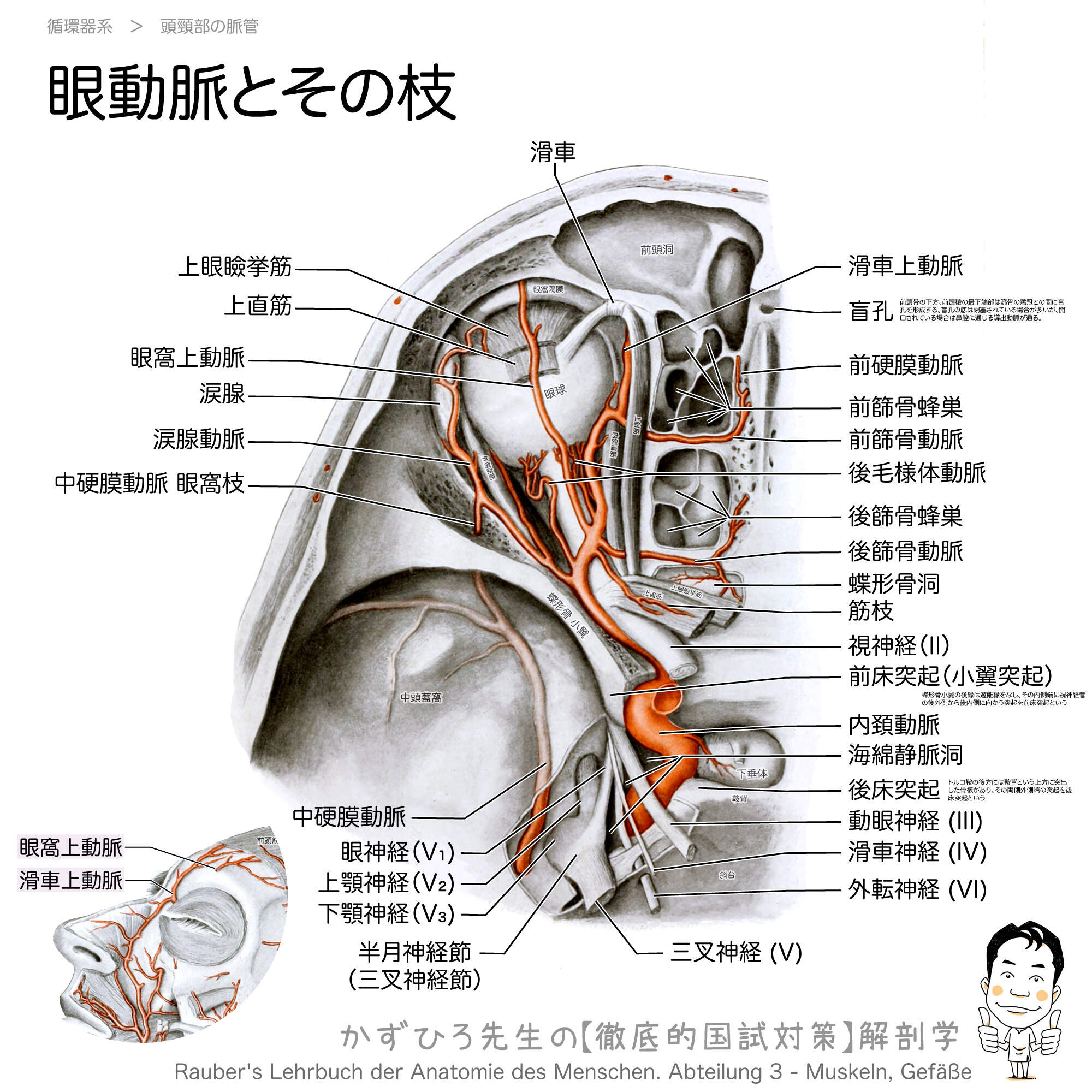 眼動脈は内頚動脈から分岐し、視神経とともに視神経管を通過して眼窩に入ります。網膜中心動脈をはじめ、涙腺動脈、毛様体動脈、篩骨動脈などを分枝して眼球と眼窩を栄養します。海綿静脈洞内を通過するのは内頚動脈と外転神経であり、動眼神経などは外側壁を通過することを区別して覚えましょう。