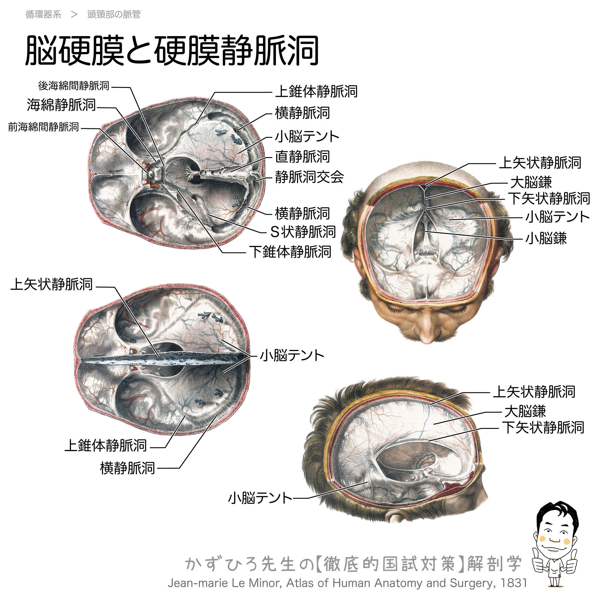 脳硬膜は大脳鎌、小脳テント、小脳鎌などのヒダを形成し、これらに沿って硬膜静脈洞が存在します。大脳鎌の上縁に上矢状静脈洞、下縁に下矢状静脈洞があり、静脈洞交会で合流して横静脈洞、S状静脈洞を経て内頚静脈となります。小脳テントは大脳と小脳を分け、テント切痕を中脳が通過することが臨床的に重要です。
