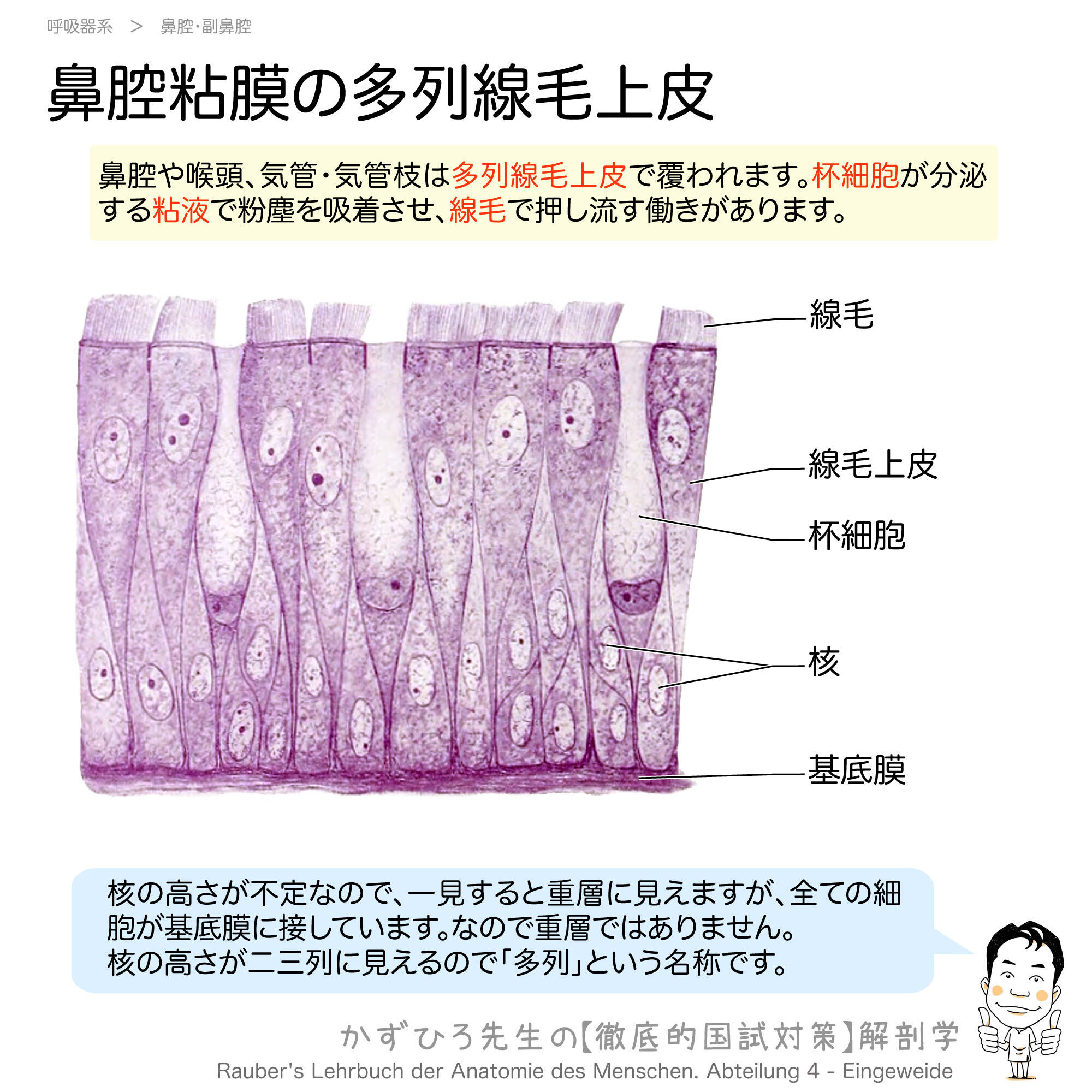 鼻前庭以外の鼻腔粘膜は多列線毛上皮で覆われています。