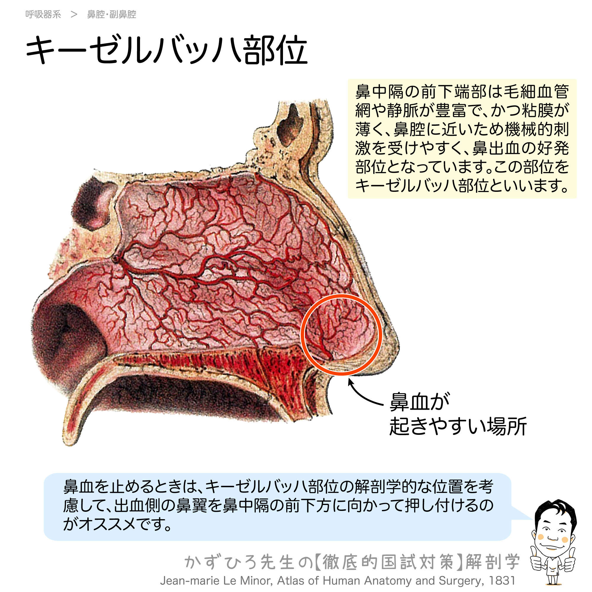 キーゼルバッハ部位は鼻出血(鼻血)の好発部位として非常に重要な解剖学的構造です。臨床的にも出題頻度が高く、その位置と特徴をしっかり理解することが必要です。この記事では、キーゼルバッハ部位の解剖学的特徴と臨床的意義を詳しく解説します。
