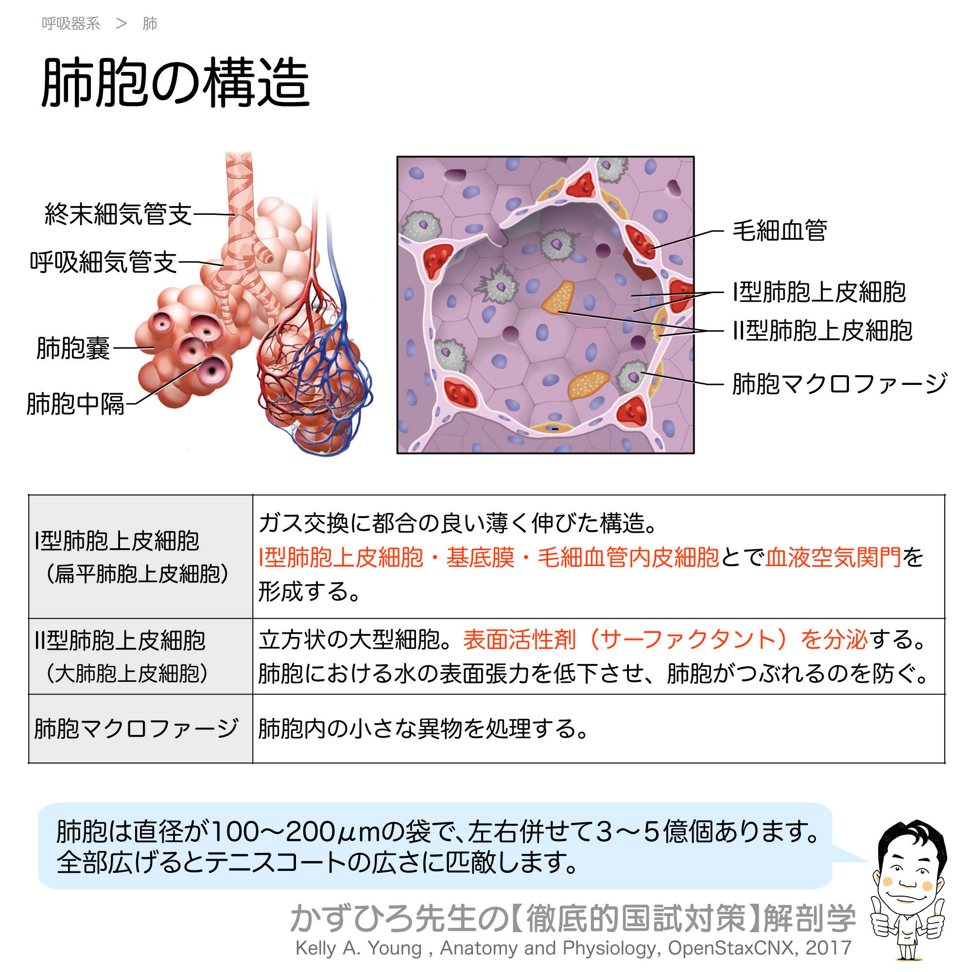 | II型肺胞上皮細胞 | 大肺胞上皮細胞 | 立方状の大型細胞。表面活性剤(サーファクタント)を分泌する。肺胞における水の表面張力を低下させ、肺胞がつぶれるのを防ぐ |