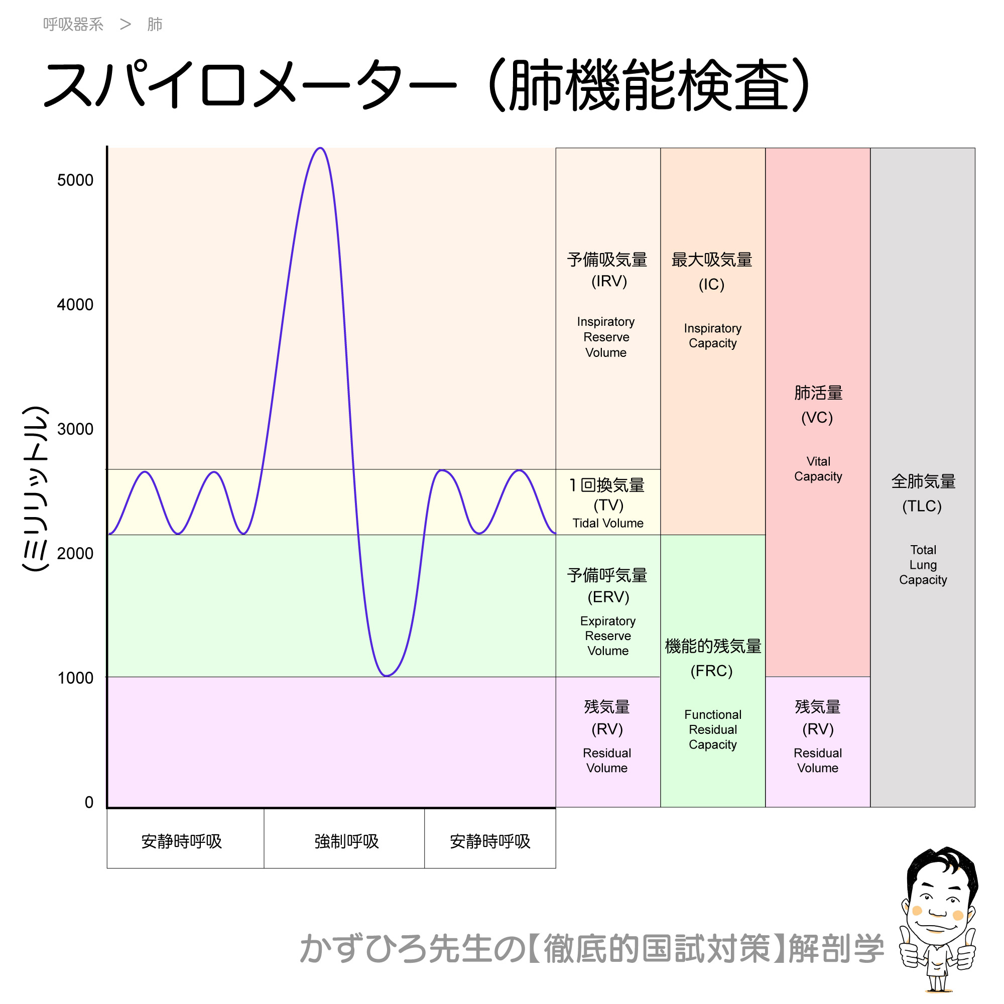 | 1回換気量 | TV | 安静時の1回の呼吸量(約500ml) |