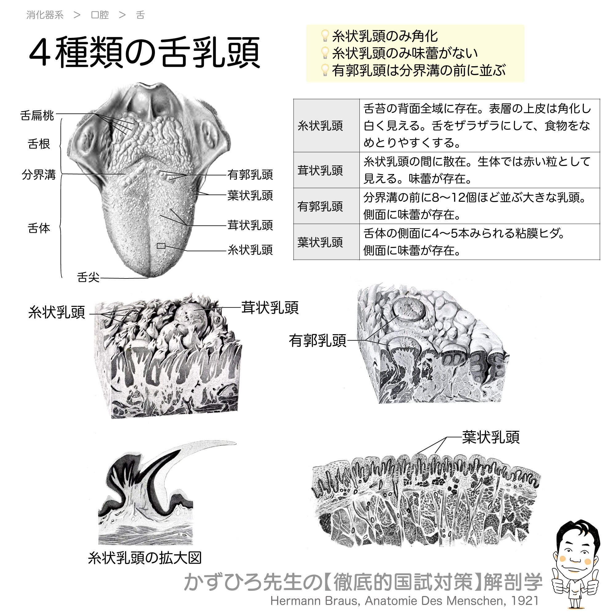 糸状乳頭の2つの特徴(角化、味蕾なし)は国試頻出です。