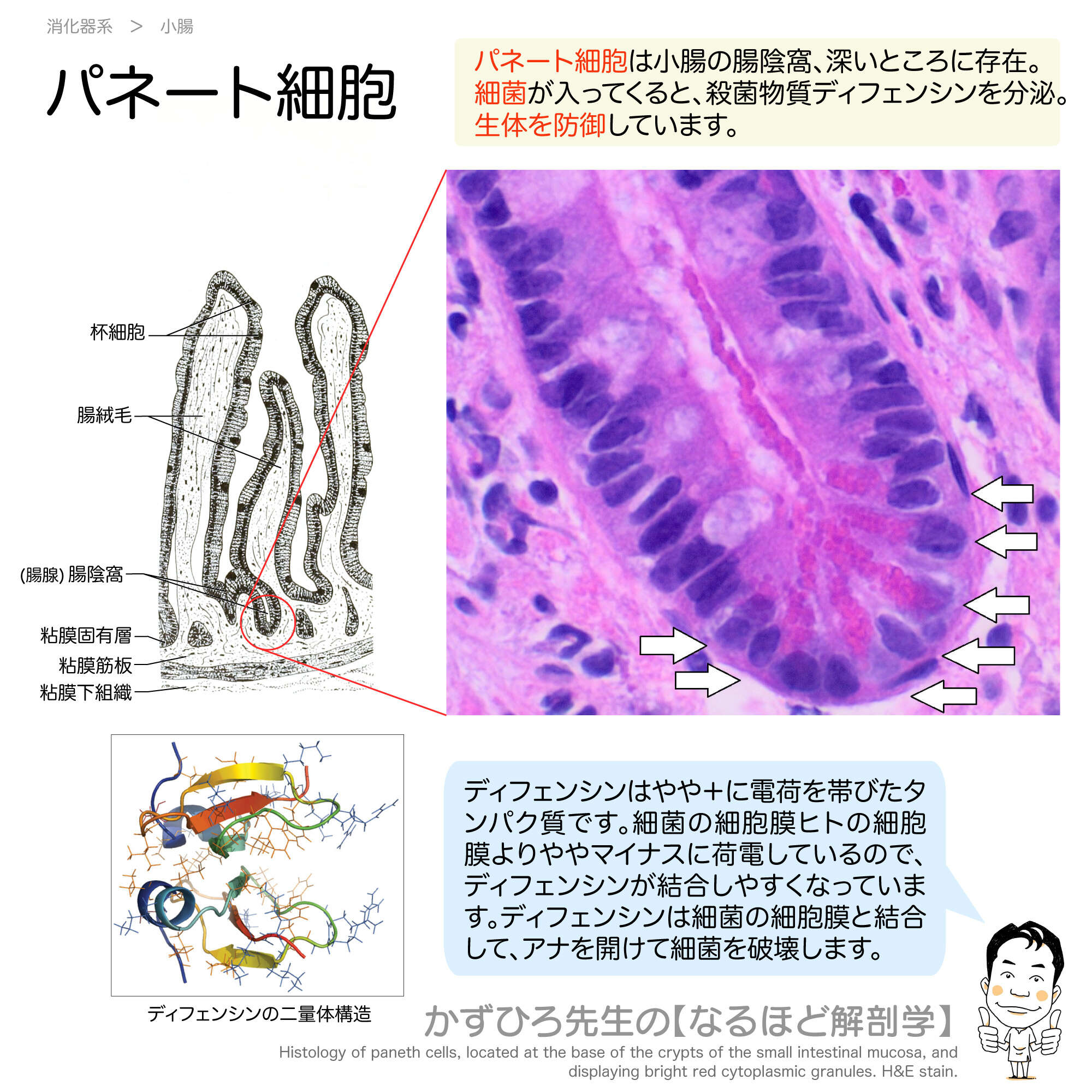 パネート細胞は小腸の腸陰窩(クリプト)の深部に存在し、殺菌物質ディフェンシンを分泌して腸管の自然免疫に関与する重要な細胞です。その機能と作用機序を理解しましょう。
