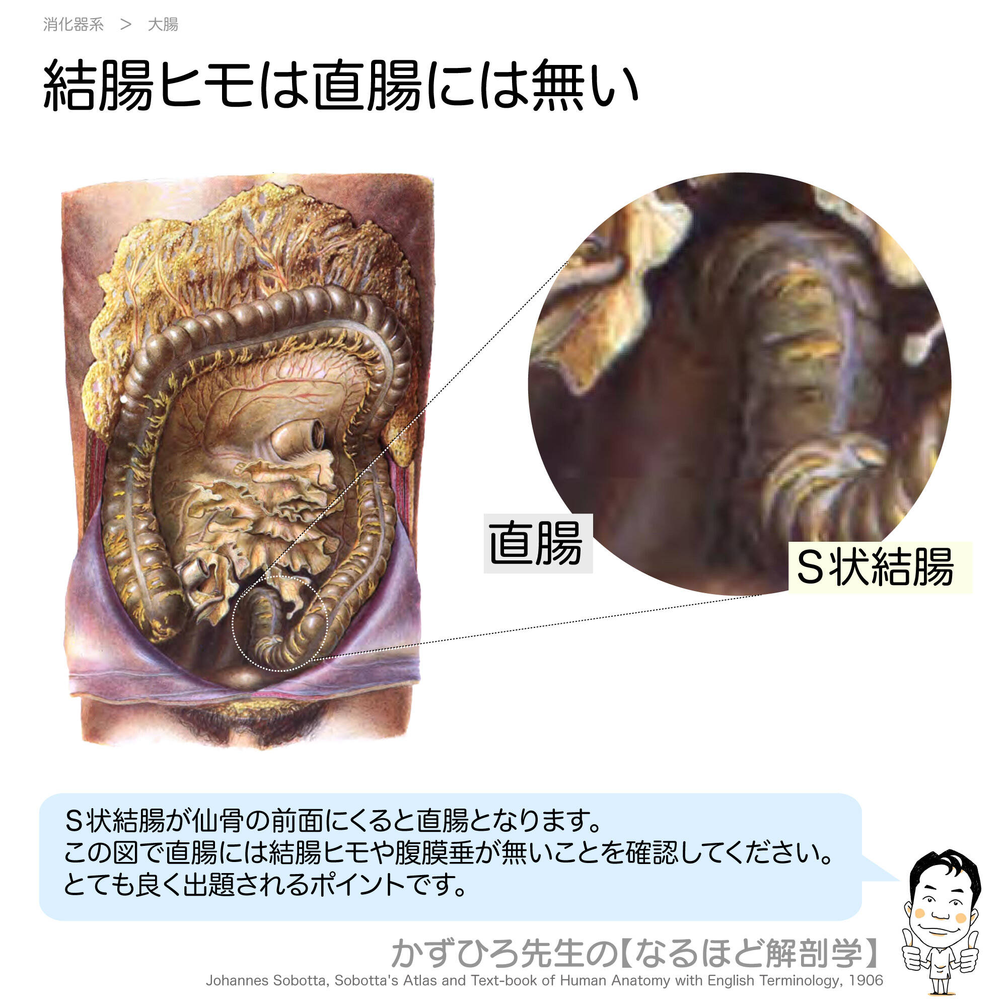 直腸には結腸ヒモや腹膜垂が無いことがポイントです。