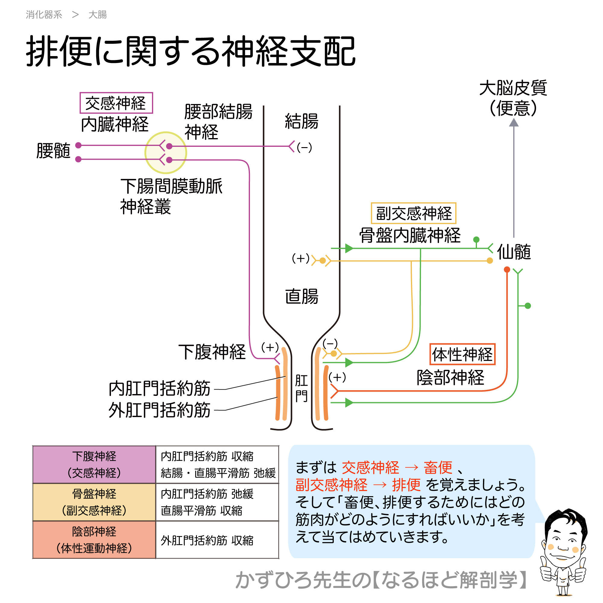 - 骨盤神経(副交感): 内肛門括約筋弛緩、直腸収縮