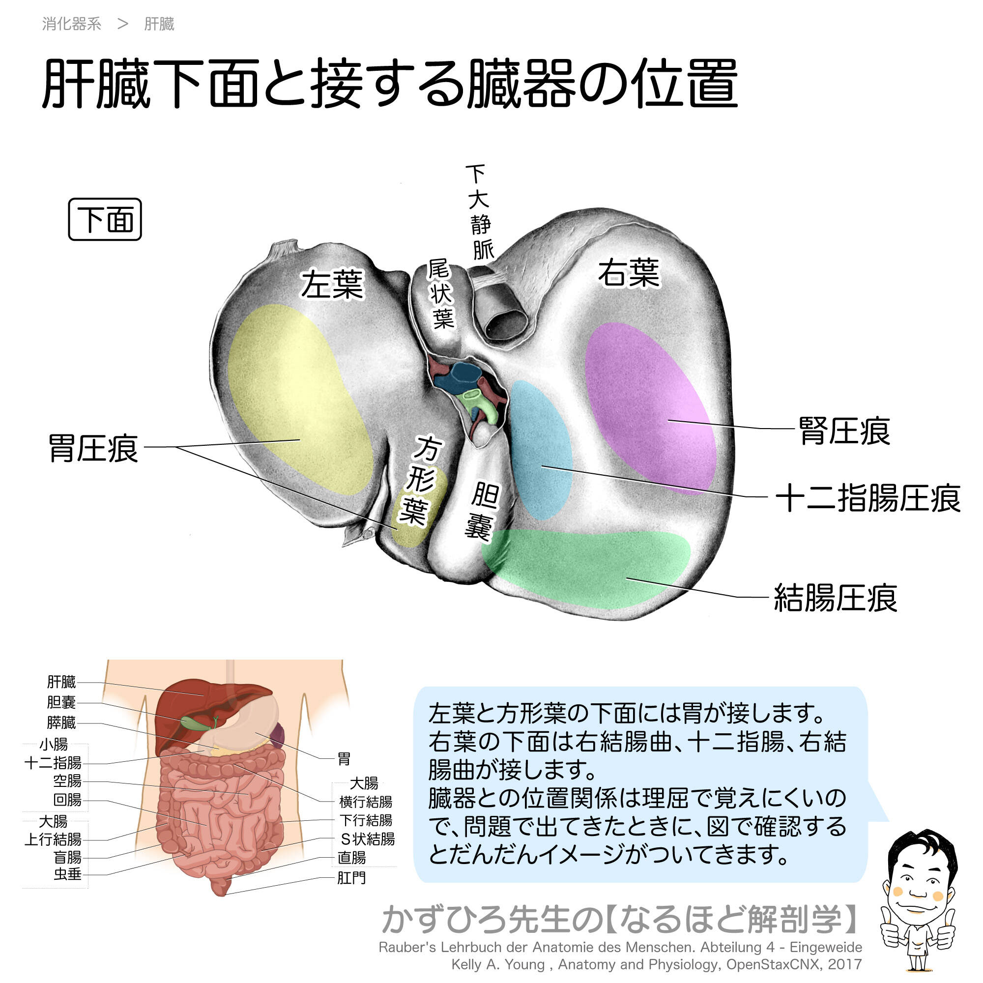 肝臓下面には、周囲の臓器による圧痕(くぼみ)があります。胃圧痕・腎圧痕・十二指腸圧痕・結腸圧痕の位置を理解し、肝臓と周囲臓器の位置関係を把握しましょう。