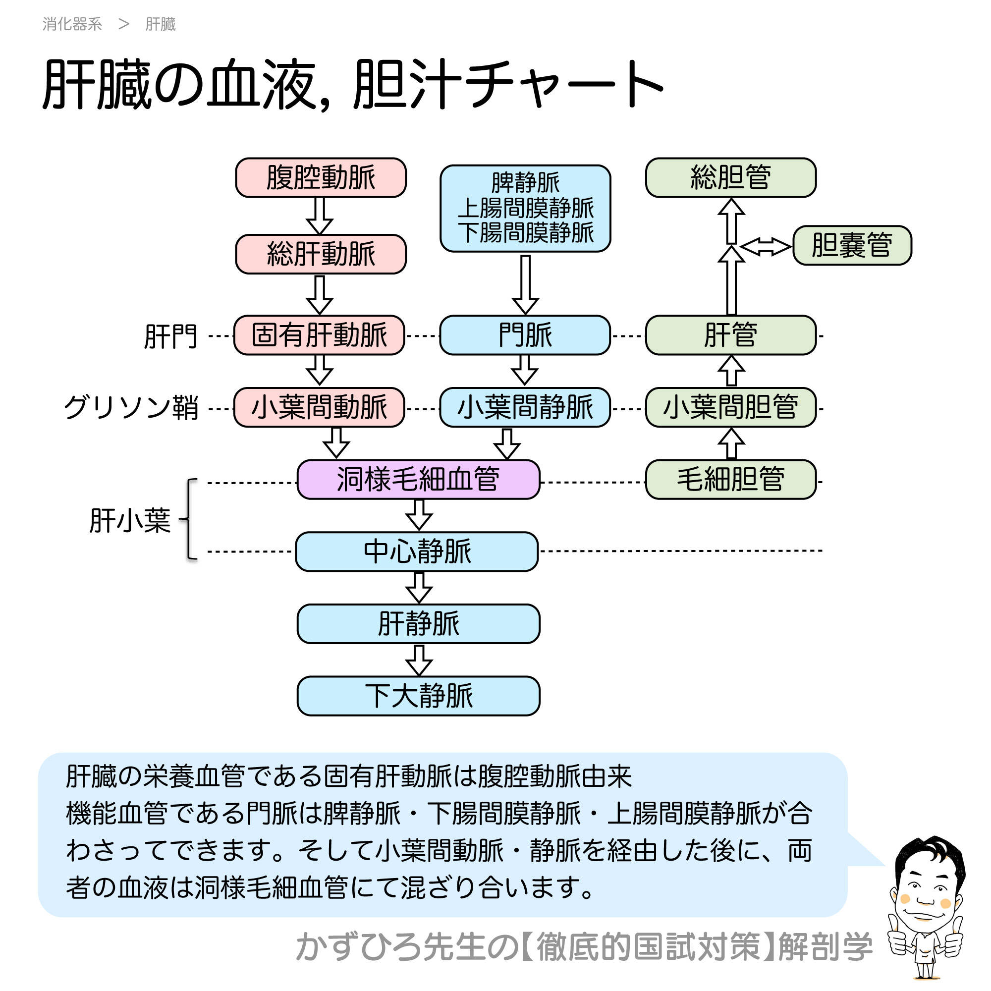 肝臓には栄養血管(固有肝動脈)と機能血管(門脈)の2系統の血液が流入し、類洞で混合します。血液と胆汁の流れを系統的に理解しましょう。