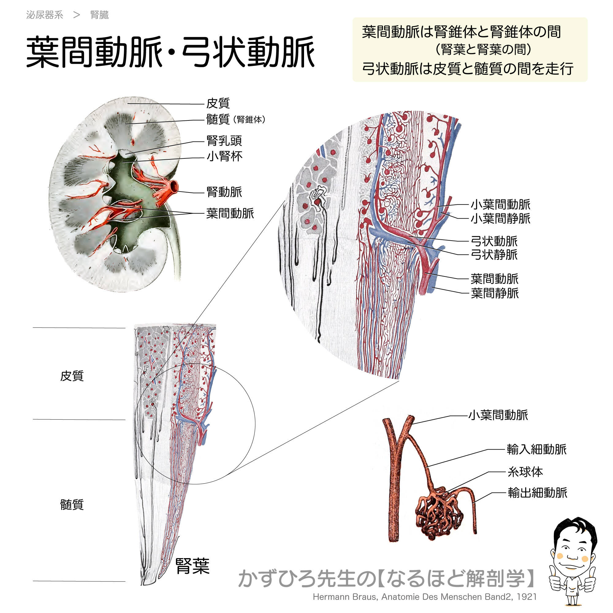 葉間動脈は腎柱(腎錐体間)を走行し、弓状動脈は皮質と髄質の境界を走行します。