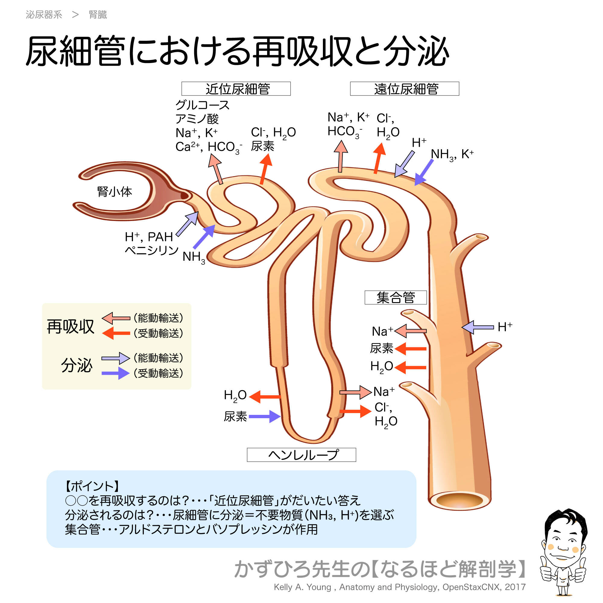 尿細管では様々な物質の再吸収と分泌が行われています。どの部位で何が再吸収・分泌されるかを理解することは、腎機能を学ぶ上で非常に重要です。この記事では、尿細管における再吸収と分泌について詳しく解説します。